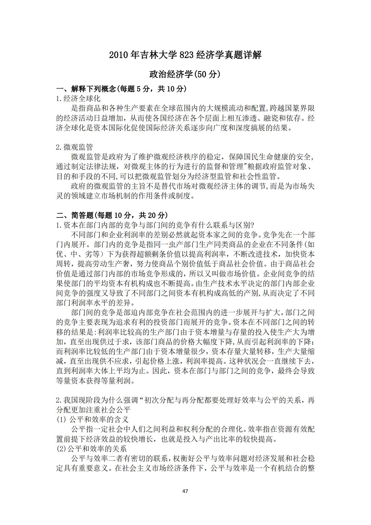 472010年吉林大学823经济学真题详解政治经济学(50分)一、解释下列概念(每题5分,共10分)1.经济全球化是指商品和各种生产要素在全球范围内的大规模流动和配置,跨越国篆界限的经济活动日益增加,从而使各国经济在各个层面上相互渗透、融瓷和依存。经济全球化是资本国际化促使国际经济关系逐步向广度和深度搞展的结果。2.微观监管微观监管是政府为了维护微观经济秩序的稳定,保障国民生命健康的安全,通过制定法律法规,对微观主体的行为进行的监督和管理"粮据政府监管对象、目的和手段的不同,可以把微观监管划分为经济型监管和社会性监管。政府的微观监管的主旨不是替代市场对微观经济主体的调节,而是为市场失灵的领域建...