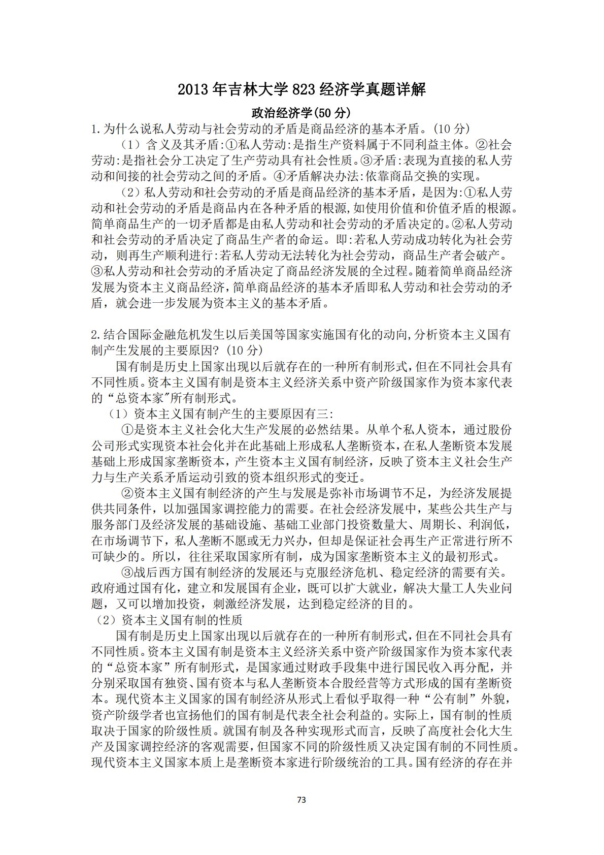 732013年吉林大学823经济学真题详解政治经济学(50分)1.为什么说私人劳动与社会劳动的矛盾是商品经济的基本矛盾。(10分)(1)含义及其矛盾:①私人劳动:是指生产资料属于不同利益主体。②社会劳动:是指社会分工决定了生产劳动具有社会性质。③矛盾:表现为直接的私人劳动和间接的社会劳动之间的矛盾。④矛盾解决办法:依靠商品交换的实现。(2)私人劳动和社会劳动的矛盾是商品经济的基本矛盾,是因为:①私人劳动和社会劳动的矛盾是商品内在各种矛盾的根源,如使用价值和价值矛盾的根源。简单商品生产的一切矛盾都是由私人劳动和社会劳动的矛盾决定的。②私人劳动和社会劳动的矛盾决定了商品生产者的命运。即:若私人劳动...