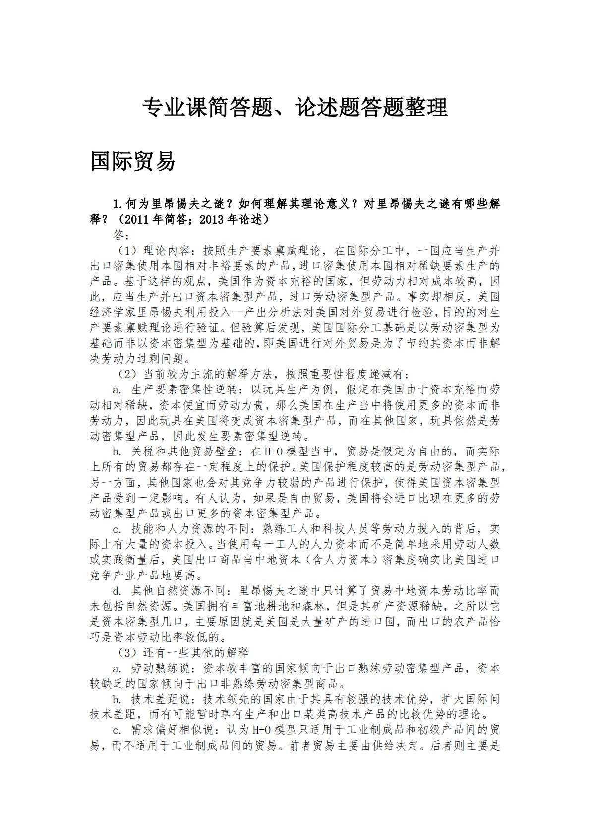 专业课简答题、论述题答题整理国际贸易1.何为里昂惕夫之谜?如何理解其理论意义?对里昂惕夫之谜有哪些解释?(2011年简答;2013年论述)答:(1)理论内容:按照生产要素禀赋理论,在国际分工中,一国应当生产并出口密集使用本国相对丰裕要素的产品,进口密集使用本国相对稀缺要素生产的产品。基于这样的观点,美国作为资本充裕的国家,但劳动力相对成本较高,因此,应当生产并出口资本密集型产品,进口劳动密集型产品。事实却相反,美国经济学家里昂惕夫利用投入—产出分析法对美国对外贸易进行检验,目的的对生产要素禀赋理论进行验证。但验算后发现,美国国际分工基础是以劳动密集型为基础而非以资本密集型为基础的,即美国进行对...
