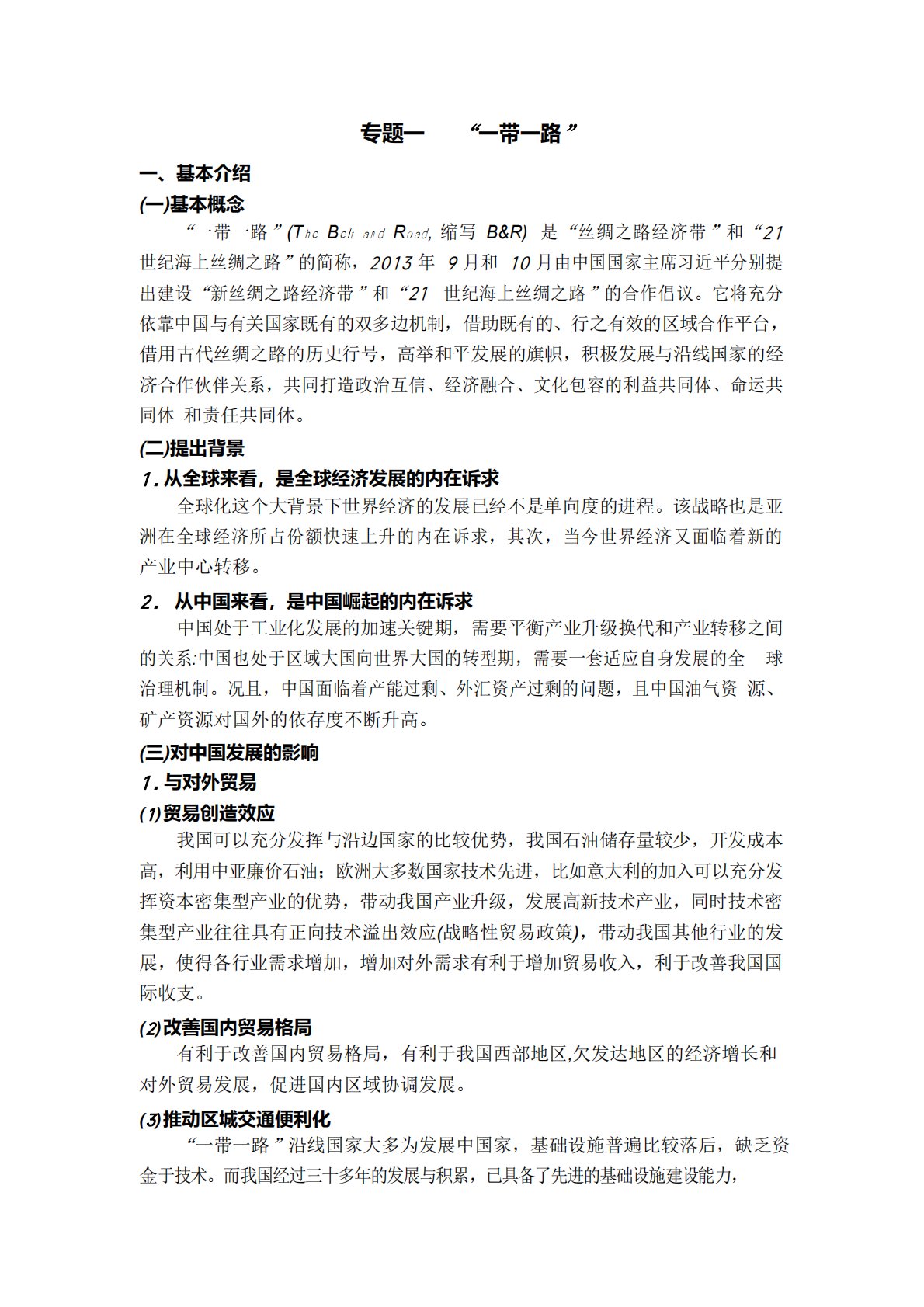 专题一“一带一路”一、基本介绍(一)基本概念“一带一路”(TheBeltandRoad,缩写B&R)是“丝绸之路经济带”和“21世纪海上丝绸之路”的简称,2013年9月和10月由中国国家主席习近平分别提出建设“新丝绸之路经济带”和“21世纪海上丝绸之路”的合作倡议。它将充分依靠中国与有关国家既有的双多边机制,借助既有的、行之有效的区域合作平台,借用古代丝绸之路的历史行号,高举和平发展的旗帜,积极发展与沿线国家的经济合作伙伴关系,共同打造政治互信、经济融合、文化包容的利益共同体、命运共同体和责任共同体。(二)提出背景1.从全球来看,是全球经济发展的内在诉求全球化这个大背景下世界经济的发展已经不是...