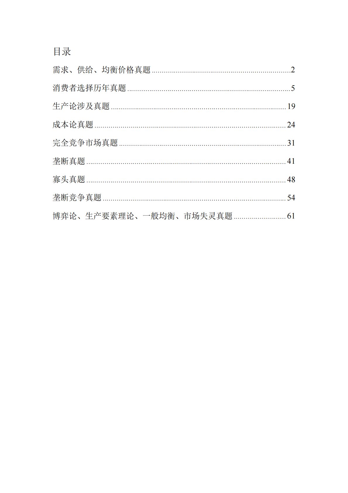 目录需求、供给、均衡价格真题.....................................................................2消费者选择历年真题.................................................................................5生产论涉及真题.......................................................................................19成本论真题...........................