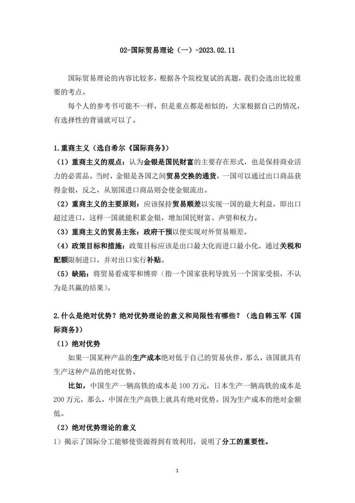 102-国际贸易理论(一)-2023.02.11国际贸易理论的内容比较多,根据各个院校复试的真题,我们会选出比较重要的考点。每个人的参考书可能不一样,但是重点都是相似的,大家根据自己的情况,有选择性的背诵就可以了。1.重商主义(选自希尔《国际商务》)(1)重商主义的观点:认为金银是国民财富的主要存在形式,也是保持商业活力的必需品。当时,金银是各国之间贸易交换的通货,一国可以通过出口商品获得金银,反之,从别国进口商品则会使金银流出。(2)重商主义的主要原则:应该保持贸易顺差以实现一国的最大利益,即出口超过进口,这样一国就能积累金银,增加国民财富、声望和权力。(3)重商主义的贸易主张:政府干预以便...