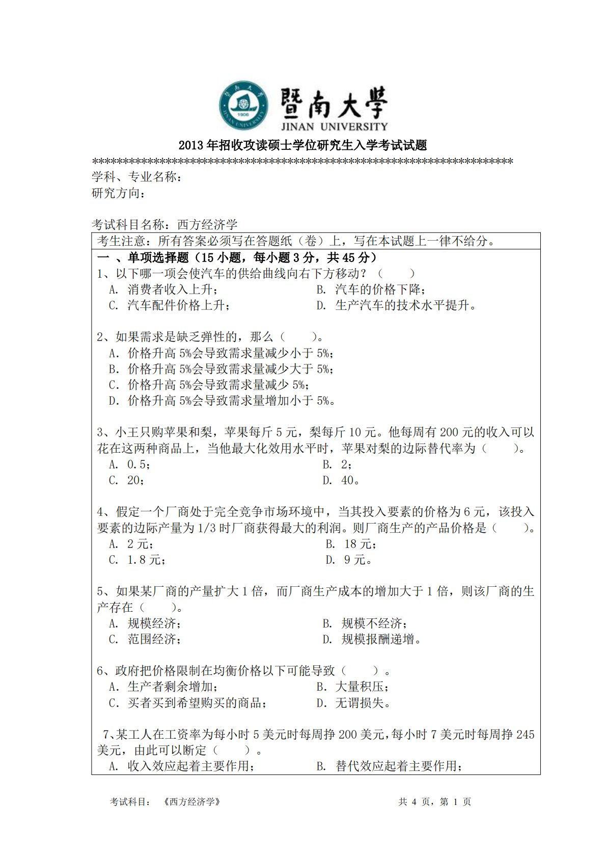 考试科目:《西方经济学》共4页,第1页2013年招收攻读硕士学位研究生入学考试试题*********************************************************************学科、专业名称:研究方向:考试科目名称:西方经济学考生注意:所有答案必须写在答题纸(卷)上,写在本试题上一律不给分。一、单项选择题(15小题,每小题3分,共45分)1、以下哪一项会使汽车的供给曲线向右下方移动?()A.消费者收入上升;B.汽车的价格下降;C.汽车配件价格上升;D.生产汽车的技术水平提升。2、如果需求是缺乏弹性的,那么()。A.价格升高5%会导致需求量减少小于5%...