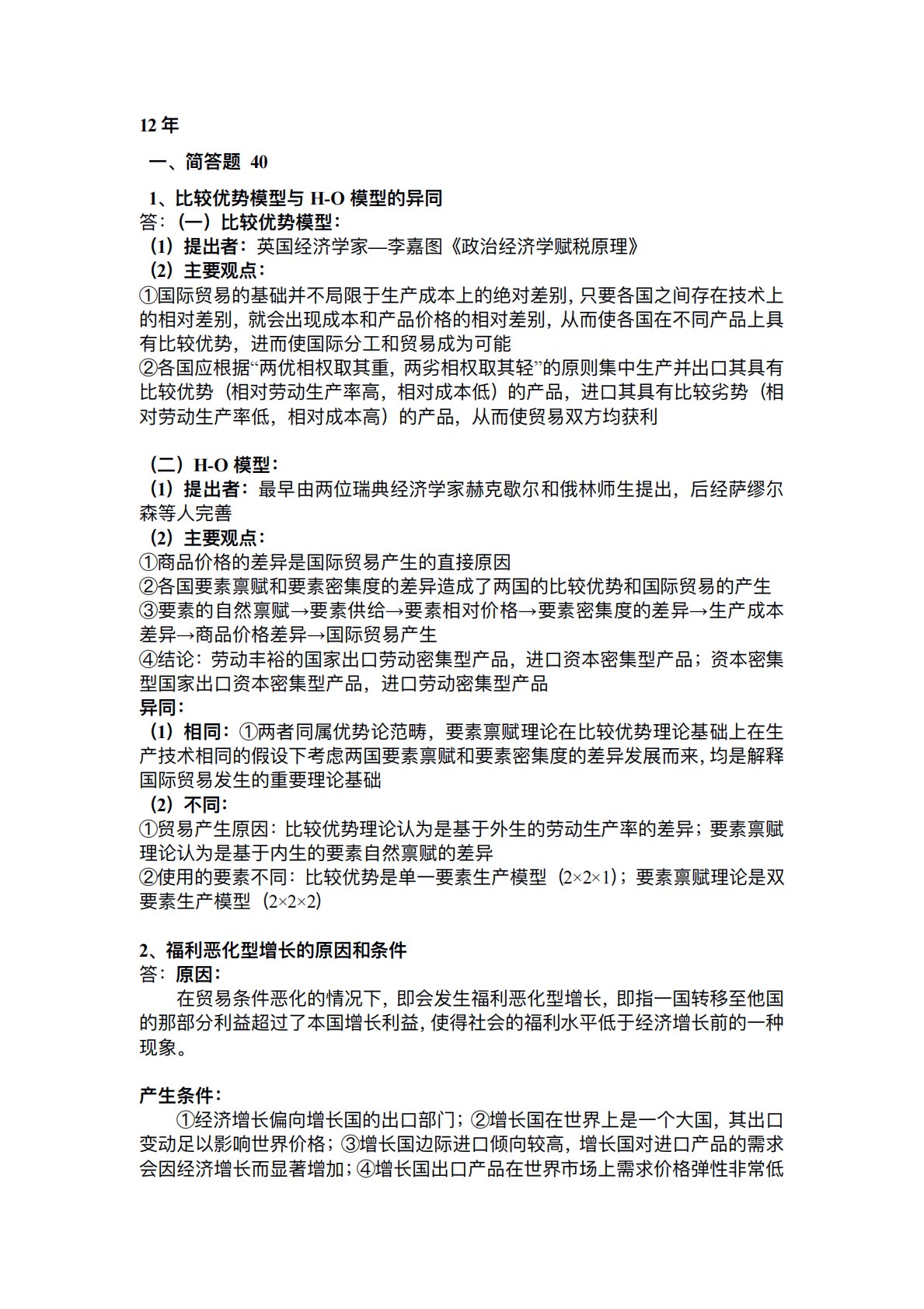 12年⼀、简答题401、⽐较优势模型与H-O模型的异同答:(⼀)⽐较优势模型:(1)提出者:英国经济学家—李嘉图《政治经济学赋税原理》(2)主要观点:①国际贸易的基础并不局限于⽣产成本上的绝对差别,只要各国之间存在技术上的相对差别,就会出现成本和产品价格的相对差别,从⽽使各国在不同产品上具有⽐较优势,进⽽使国际分⼯和贸易成为可能②各国应根据“两优相权取其重,两劣相权取其轻”的原则集中⽣产并出⼝其具有⽐较优势(相对劳动⽣产率⾼,相对成本低)的产品,进⼝其具有⽐较劣势(相对劳动⽣产率低,相对成本⾼)的产品,从⽽使贸易双⽅均获利(⼆)H-O模型:(1)提出者:最早由两位瑞典经济学家赫克歇尔和俄林师⽣...