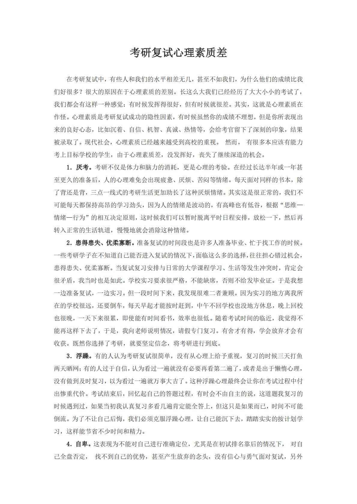 考研复试心理素质差在考研复试中,有些人和我们的水平相差无几,甚至不如我们,为什么他们的成绩比我们好很多?很大的原因在于心理素质的差别。长这么大我们已经经历了大大小小的考试了,我们都会有这样一种感觉:有时候发挥得很好,但有时候就很差。其实,这就是心理素质在作怪。心理素质是考研复试成功的隐性因素,有时候虽然你的成绩不理想,但是你所表现出来的良好心态,比如沉着、自信、机智、真诚、热情等,会给考官留下了深刻的印象,结果被录取了。现代社会,心理素质已经越来越受到高校的重视。然而,有很多本应该有能力考上目标学校的学生,由于心理素质差,没发挥好,丧失了继续深造的机会。1.厌考。考研不仅是体力和脑力的消耗,更...
