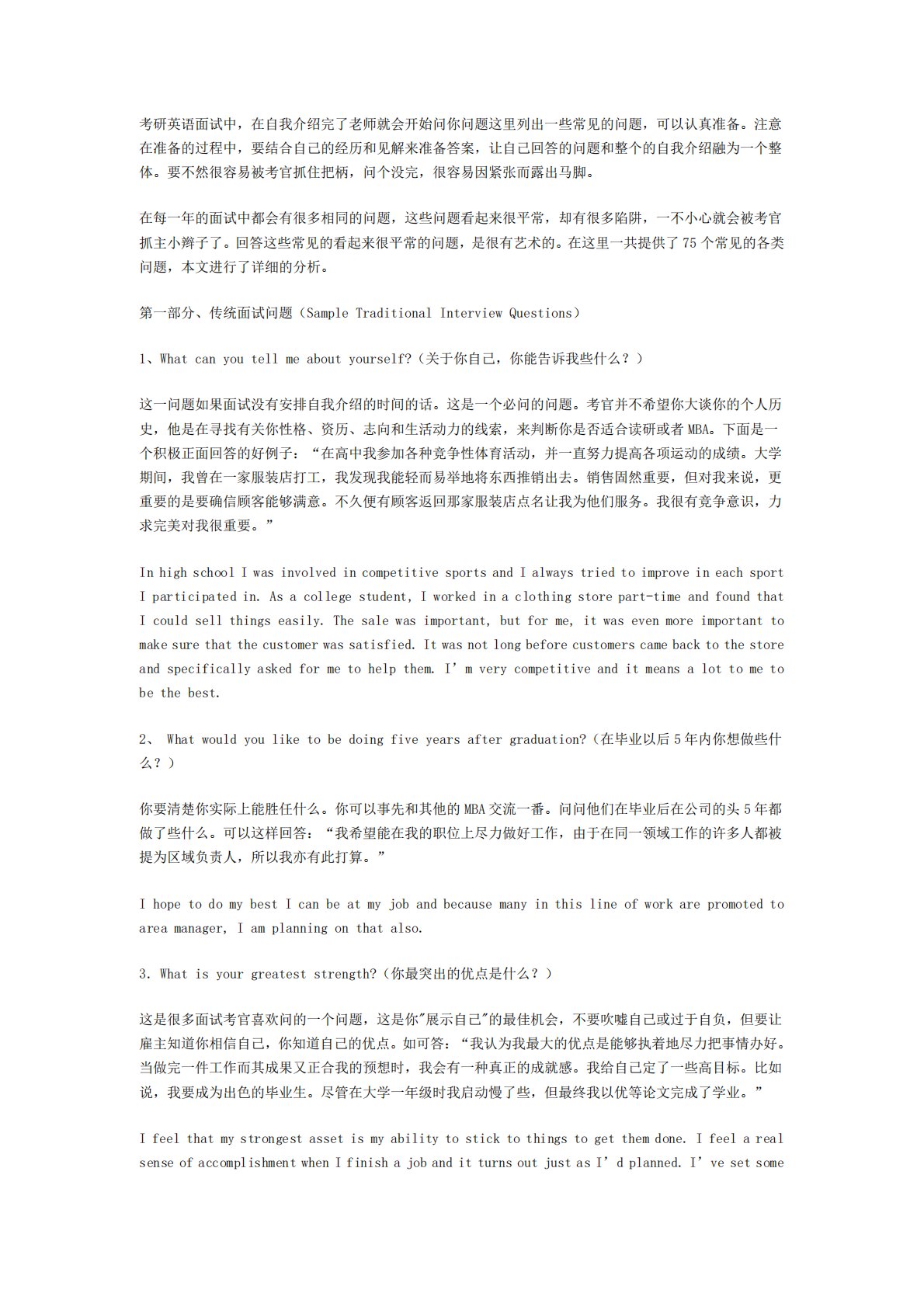 考研英语面试中,在自我介绍完了老师就会开始问你问题这里列出一些常见的问题,可以认真准备。注意在准备的过程中,要结合自己的经历和见解来准备答案,让自己回答的问题和整个的自我介绍融为一个整体。要不然很容易被考官抓住把柄,问个没完,很容易因紧张而露出马脚。在每一年的面试中都会有很多相同的问题,这些问题看起来很平常,却有很多陷阱,一不小心就会被考官抓主小辫子了。回答这些常见的看起来很平常的问题,是很有艺术的。在这里一共提供了75个常见的各类问题,本文进行了详细的分析。第一部分、传统面试问题(SampleTraditionalInterviewQuestions)1、Whatcanyoutellmeab...