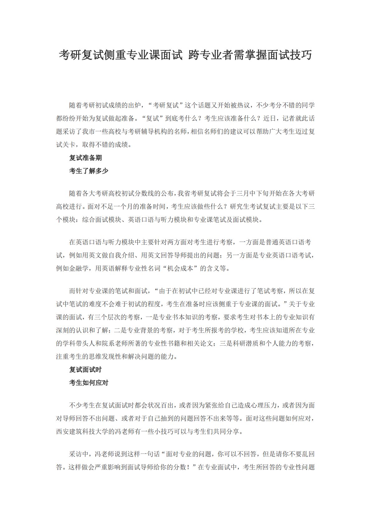 考研复试侧重专业课面试跨专业者需掌握面试技巧随着考研初试成绩的出炉,“考研复试”这个话题又开始被热议,不少考分不错的同学都纷纷开始为复试做起准备。“复试”到底考什么?考生应该准备什么?近日,记者就此话题采访了我市一些高校与考研辅导机构的名师,相信名师们的建议可以帮助广大考生迈过复试关卡,取得不错的成绩。复试准备期考生了解多少随着各大考研高校初试分数线的公布,我省考研复试将会于三月中下旬开始在各大考研高校进行。面对不足一个月的准备时间,考生应该做些什么?研究生考试复试主要是以下三个模块:综合面试模块、英语口语与听力模块和专业课笔试及面试模块。在英语口语与听力模块中主要针对两方面对考生进行考察,一...