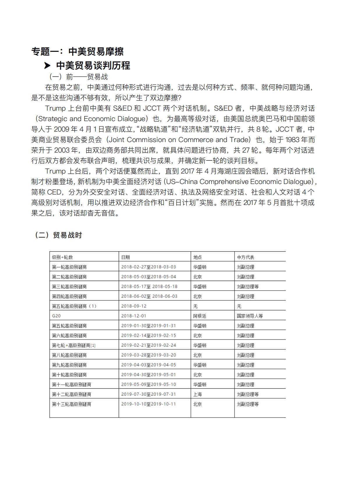 专题⼀:中美贸易摩擦中美贸易谈判历程(⼀)前——贸易战在贸易之前,中美通过何种形式进⾏沟通,过去是以何种⽅式、频率、就何种问题沟通,是不是这些沟通不够有效,所以产⽣了双边摩擦?Trump上台前中美有S&ED和JCCT两个对话机制。S&ED者,中美战略与经济对话(StrategicandEconomicDialogue)也,为最⾼等级对话,由美国总统奥巴⻢和中国前领导⼈于2009年4⽉1⽇宣布成⽴,“战略轨道”和“经济轨道”双轨并⾏,共8轮。JCCT者,中美商业贸易联合委员会(JointCommissiononCommerceandTrade)也,始于1983年⽽荣升于2003年,由双边商...