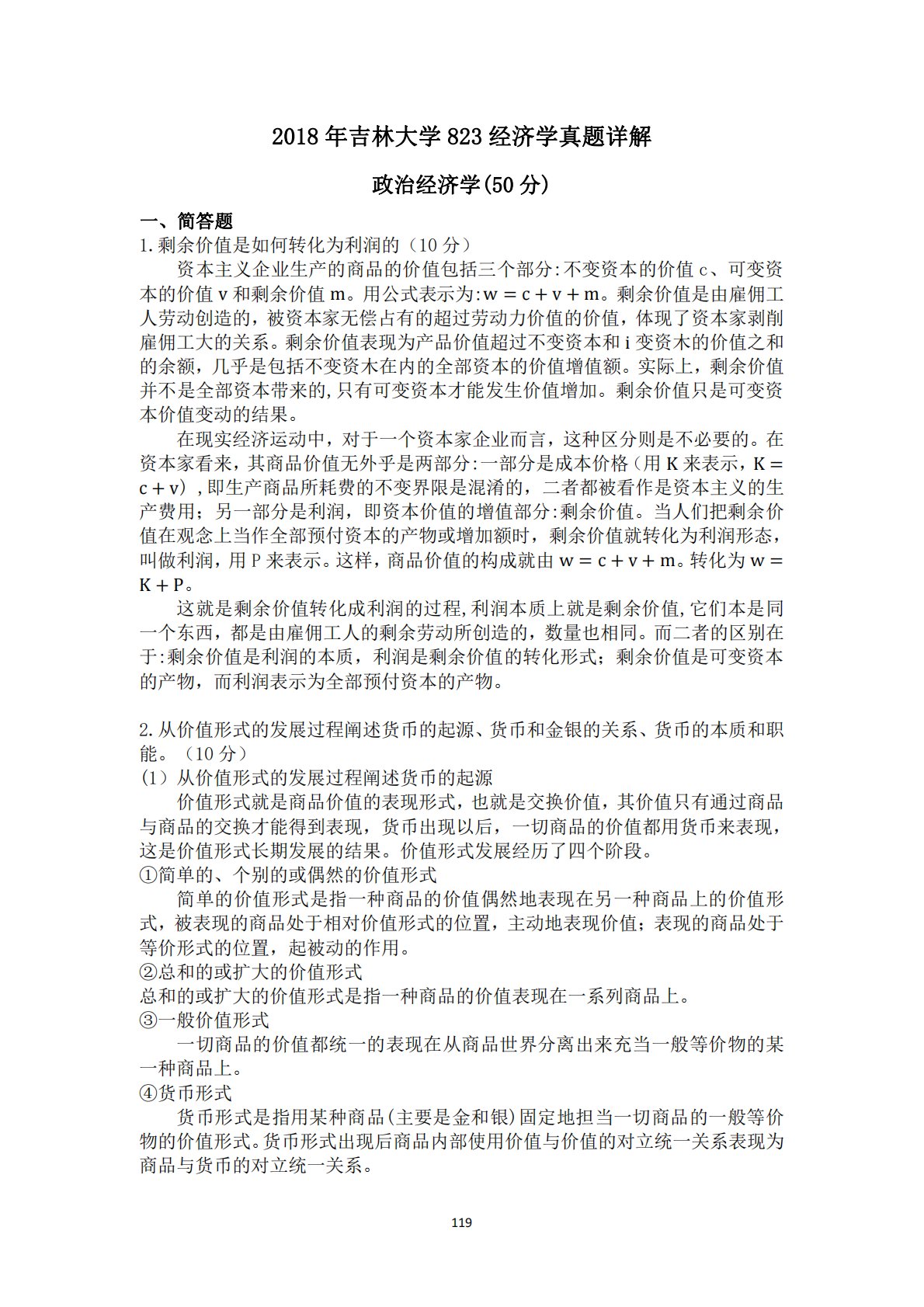1192018年吉林大学823经济学真题详解政治经济学(50分)一、简答题1.剩余价值是如何转化为利润的(10分)资本主义企业生产的商品的价值包括三个部分:不变资本的价值c、可变资本的价值v和剩余价值m。用公式表示为:w=c+v+m。剩余价值是由雇佣工人劳动创造的,被资本家无偿占有的超过劳动力价值的价值,体现了资本家剥削雇佣工大的关系。剩余价值表现为产品价值超过不变资本和i变资木的价值之和的余额,几乎是包括不变资木在内的全部资本的价值增值额。实际上,剩余价值并不是全部资本带来的,只有可变资本才能发生价值增加。剩余价值只是可变资本价值变动的结果。在现实经济运动中,对于一个资本家企业而言,这种区分...