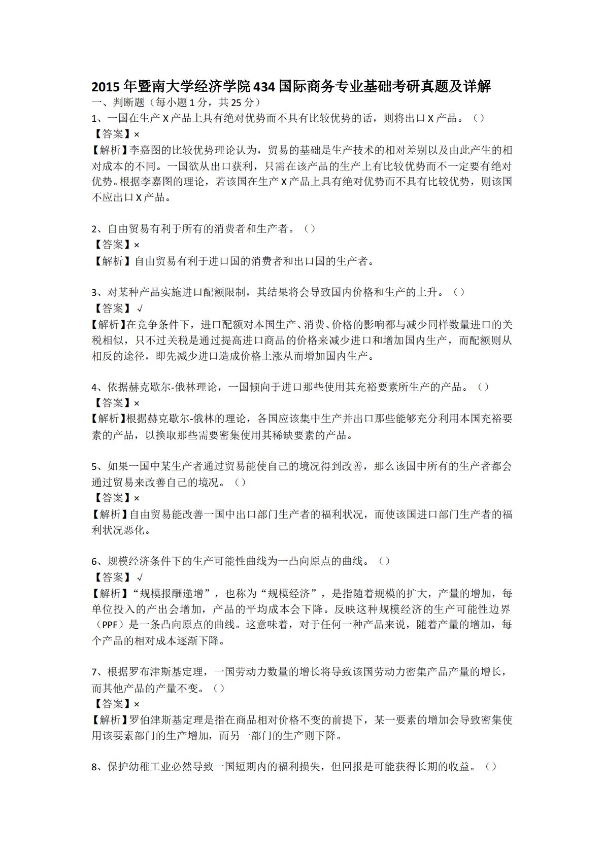 2015年暨南大学经济学院434国际商务专业基础考研真题及详解一、判断题(每小题1分,共25分)1、一国在生产X产品上具有绝对优势而不具有比较优势的话,则将出口X产品。()【答案】×【解析】李嘉图的比较优势理论认为,贸易的基础是生产技术的相对差别以及由此产生的相对成本的不同。一国欲从出口获利,只需在该产品的生产上有比较优势而不一定要有绝对优势。根据李嘉图的理论,若该国在生产X产品上具有绝对优势而不具有比较优势,则该国不应出口X产品。2、自由贸易有利于所有的消费者和生产者。()【答案】×【解析】自由贸易有利于进口国的消费者和出口国的生产者。3、对某种产品实施进口配额限制,其结果将会导致国内价格和...