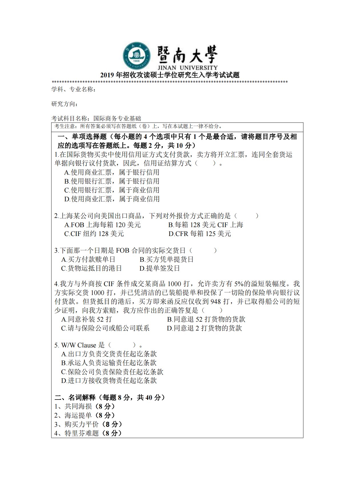 2019年招收攻读硕士学位研究生入学考试试题********************************************************************************************学科、专业名称:研究方向:考试科目名称:国际商务专业基础考生注意:所有答案必须写在答题纸(卷)上,写在本试题上一律不给分。一、单项选择题(每小题的4个选项中只有1个是最合适,请将题目序号及相应的选项写在答题纸上。每题2分,共10分)1.在国际货物买卖中使用信用证方式支付货款,卖方将开立汇票,连同全套货运单据向银行议付货款,因此,信用证结算方式()。A.使用商业汇票,属于...
