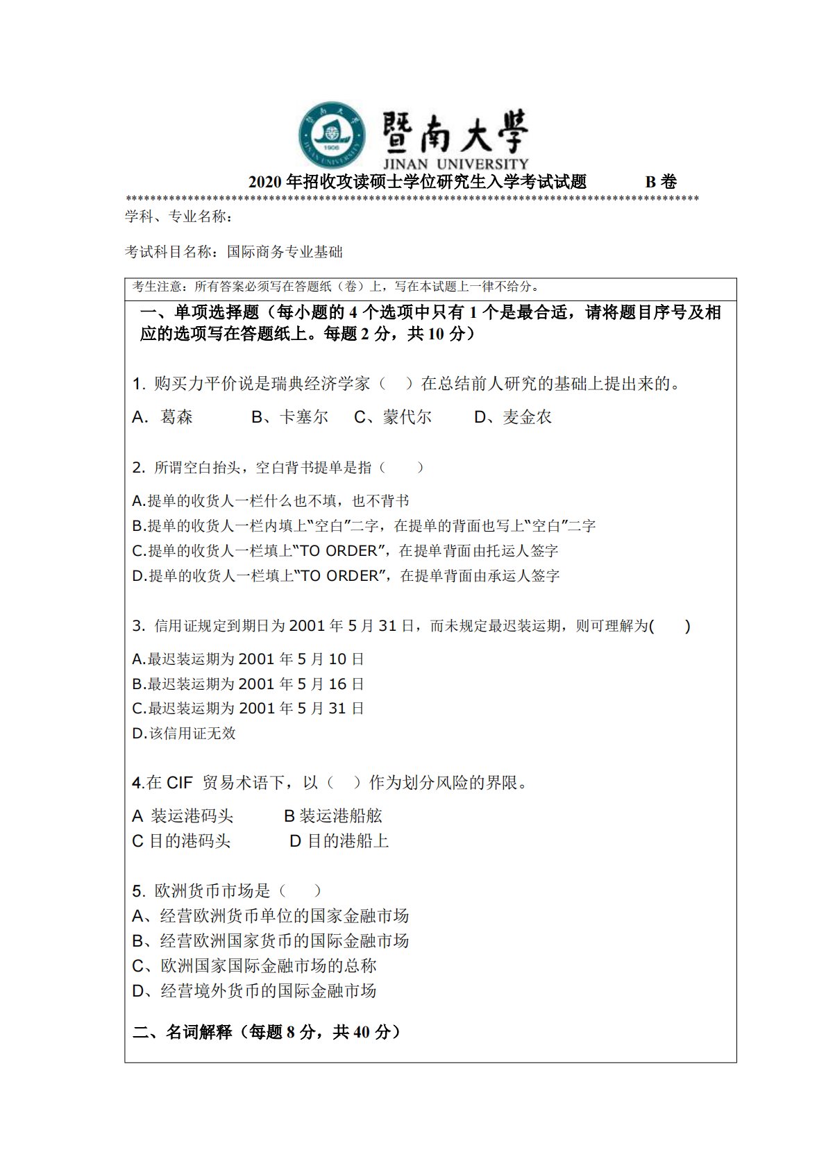 2020年招收攻读硕士学位研究生入学考试试题B卷********************************************************************************************学科、专业名称:考试科目名称:国际商务专业基础考生注意:所有答案必须写在答题纸(卷)上,写在本试题上一律不给分。一、单项选择题(每小题的4个选项中只有1个是最合适,请将题目序号及相应的选项写在答题纸上。每题2分,共10分)1.购买力平价说是瑞典经济学家()在总结前人研究的基础上提出来的。A.葛森B、卡塞尔C、蒙代尔D、麦金农2.所谓空白抬头,空白背书提单是指()A....