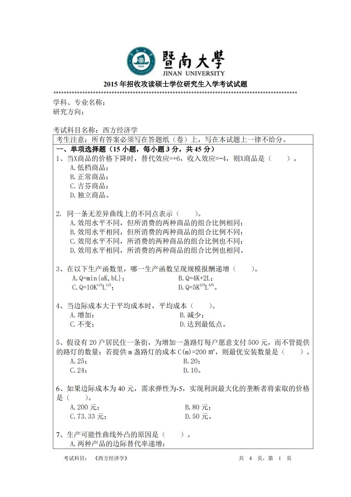 考试科目:《西方经济学》共4页,第1页2015年招收攻读硕士学位研究生入学考试试题********************************************************************************************学科、专业名称:研究方向:考试科目名称:西方经济学考生注意:所有答案必须写在答题纸(卷)上,写在本试题上一律不给分。一、单项选择题(15小题,每小题3分,共45分)1、当X商品的价格下降时,替代效应=+6,收入效应=-4,则X商品是()。A.低档商品;B.正常商品;C.吉芬商品;D.独立商品。2.同一条无差异曲线上的不同点表示()。...