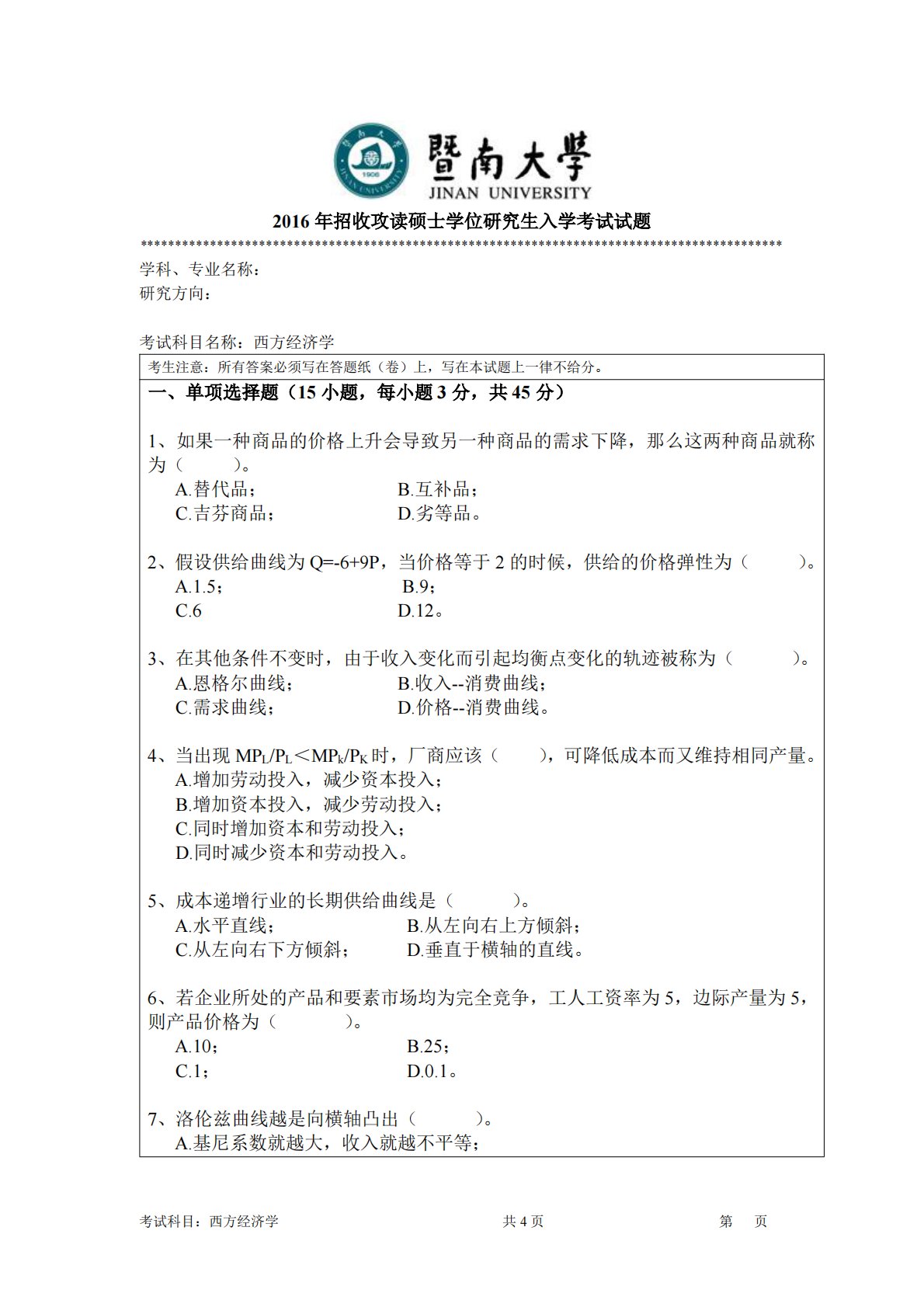考试科目:西方经济学共4页第页2016年招收攻读硕士学位研究生入学考试试题********************************************************************************************学科、专业名称:研究方向:考试科目名称:西方经济学考生注意:所有答案必须写在答题纸(卷)上,写在本试题上一律不给分。一、单项选择题(15小题,每小题3分,共45分)1、如果一种商品的价格上升会导致另一种商品的需求下降,那么这两种商品就称为()。A.替代品;B.互补品;C.吉芬商品;D.劣等品。2、假设供给曲线为Q=-6+9P,当价格等于2的...