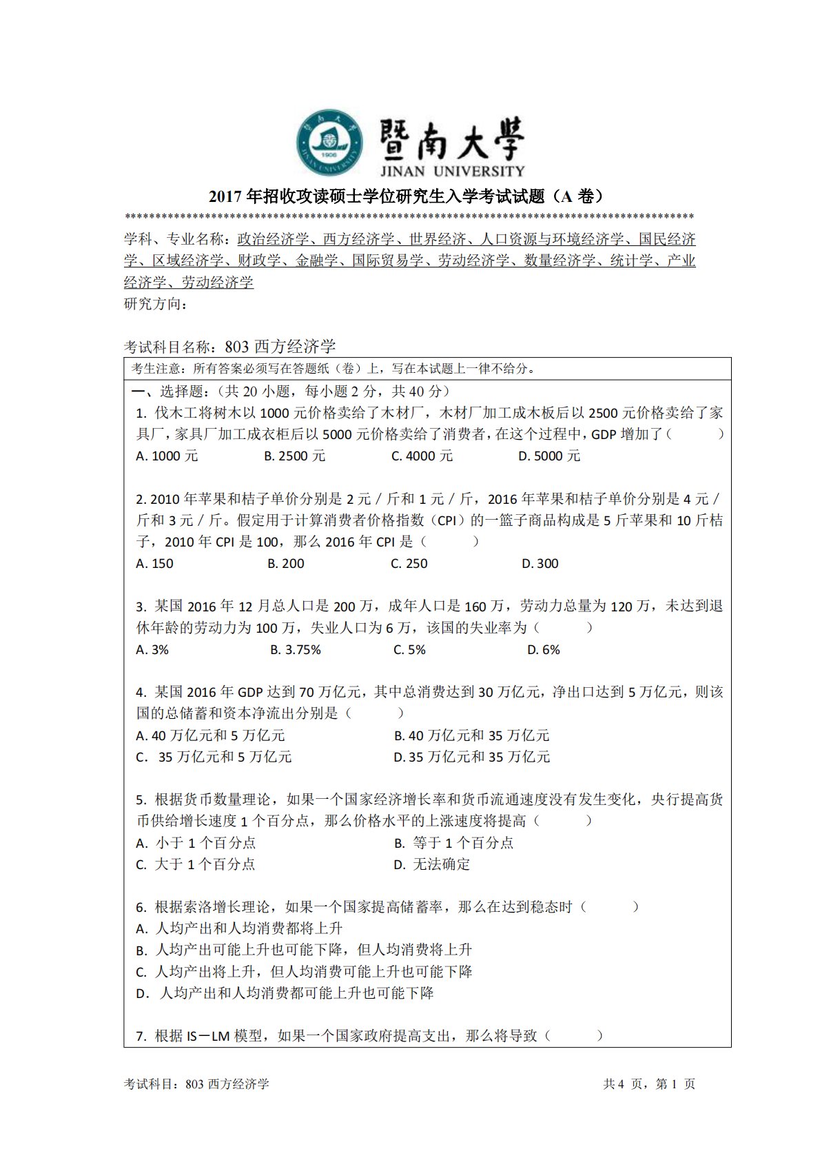 考试科目:803西方经济学共4页,第1页2017年招收攻读硕士学位研究生入学考试试题(A卷)********************************************************************************************学科、专业名称:政治经济学、西方经济学、世界经济、人口资源与环境经济学、国民经济学、区域经济学、财政学、金融学、国际贸易学、劳动经济学、数量经济学、统计学、产业经济学、劳动经济学研究方向:考试科目名称:803西方经济学考生注意:所有答案必须写在答题纸(卷)上,写在本试题上一律不给分。一、选择题:(共20小题,每小题2分,共...