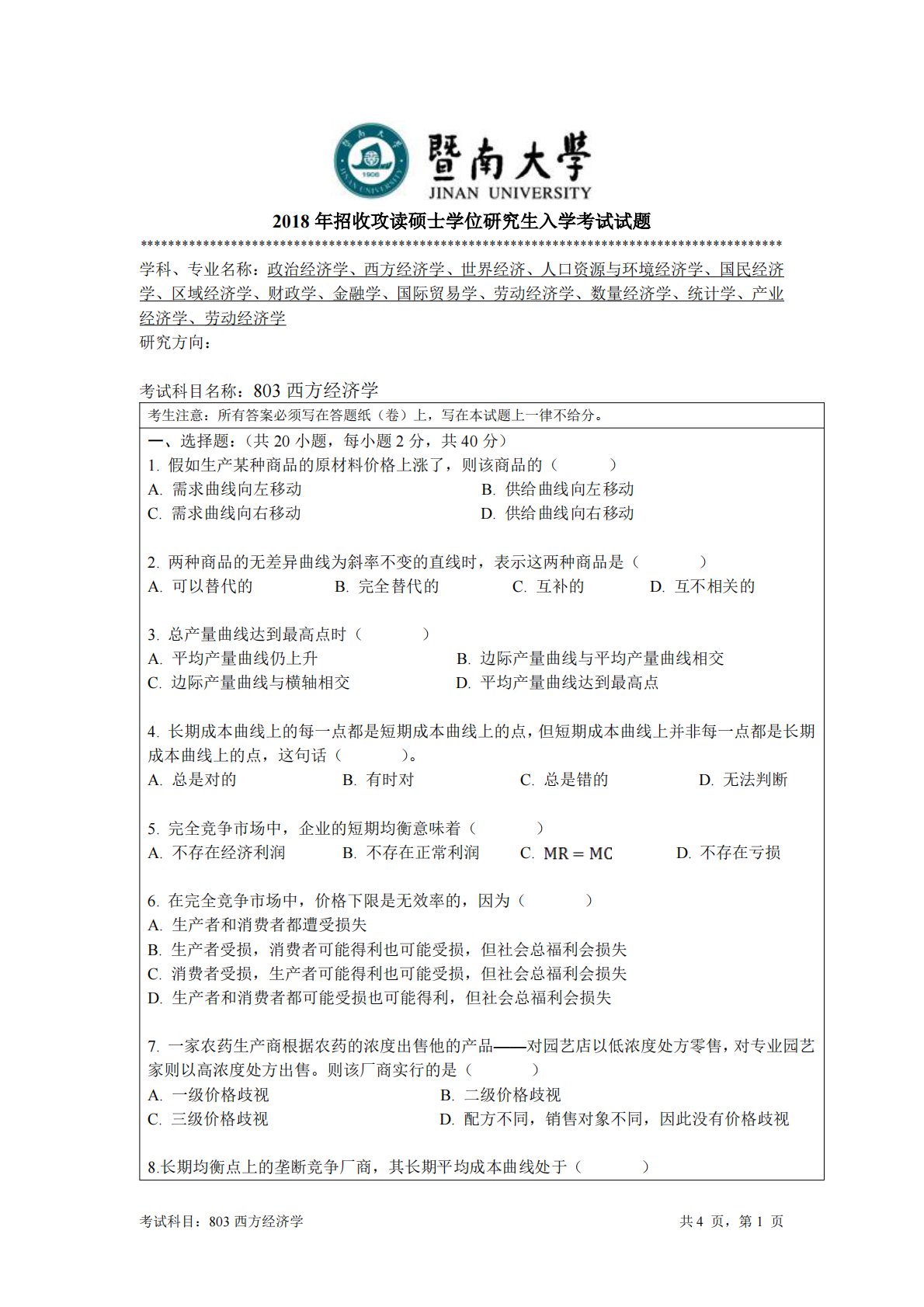 考试科目:803西方经济学共4页,第1页2018年招收攻读硕士学位研究生入学考试试题********************************************************************************************学科、专业名称:政治经济学、西方经济学、世界经济、人口资源与环境经济学、国民经济学、区域经济学、财政学、金融学、国际贸易学、劳动经济学、数量经济学、统计学、产业经济学、劳动经济学研究方向:考试科目名称:803西方经济学考生注意:所有答案必须写在答题纸(卷)上,写在本试题上一律不给分。一、选择题:(共20小题,每小题2分,共40分)...