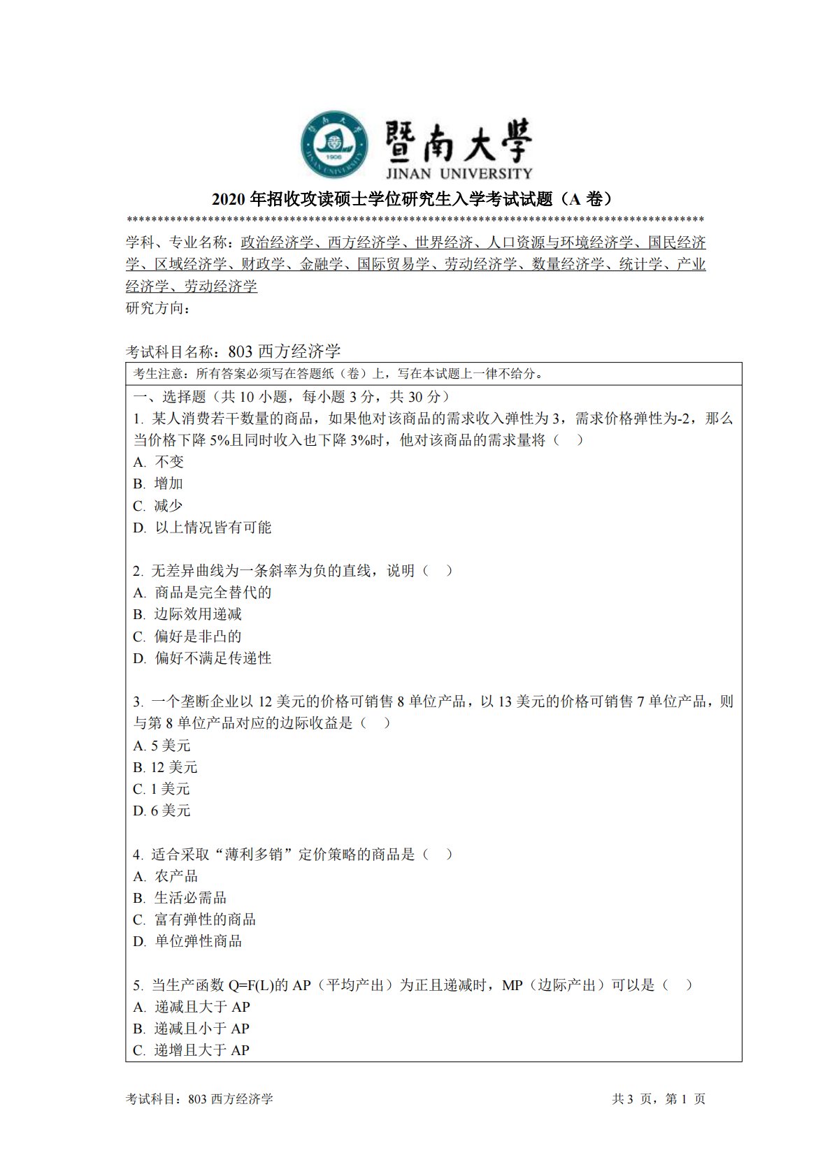考试科目:803西方经济学共3页,第1页2020年招收攻读硕士学位研究生入学考试试题(A卷)********************************************************************************************学科、专业名称:政治经济学、西方经济学、世界经济、人口资源与环境经济学、国民经济学、区域经济学、财政学、金融学、国际贸易学、劳动经济学、数量经济学、统计学、产业经济学、劳动经济学研究方向:考试科目名称:803西方经济学考生注意:所有答案必须写在答题纸(卷)上,写在本试题上一律不给分。一、选择题(共10小题,每小题3分,共3...