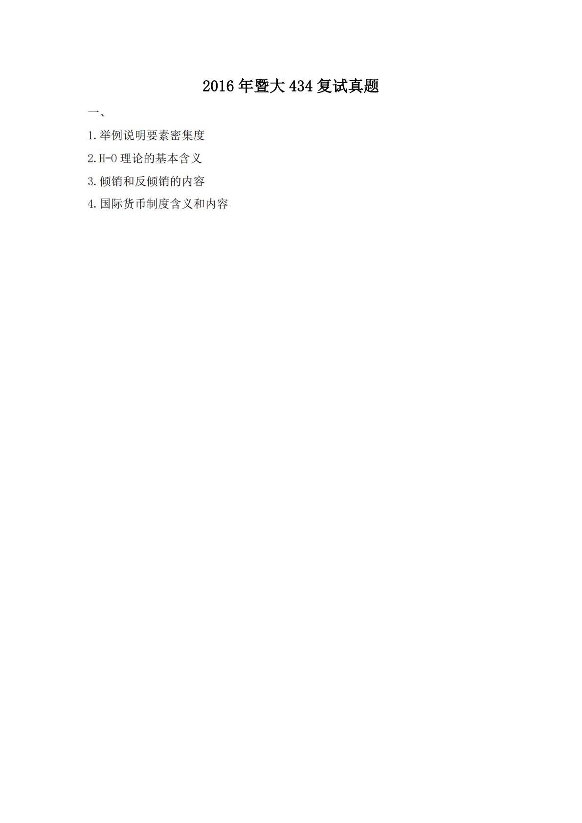 2016年暨大434复试真题一、1.举例说明要素密集度2.H-O理论的基本含义3.倾销和反倾销的内容4.国际货币制度含义和内容2016年暨大434复试真题一、1.举例说明要素密集度2.H-O理论的基本含义3.倾销和反倾销的内容4.国际货币制度含义和内容二、1.PPP的含义,什么是利率平价理论2.怎样通过关税同盟扩大出口效应3.产业内贸易与产业间贸易的基础分别是什么?两者的差异在哪?三、计算题主要是关于福利变化的四、论述国际折衷理论对中国企业走出去的影响百校文库—海量高校资料共享库百校文库是一个线上大学生专业学习资料共享平台,致力于通过用户自主上传与分享,打造一个涵盖各大高校、各学科门类的免费资...