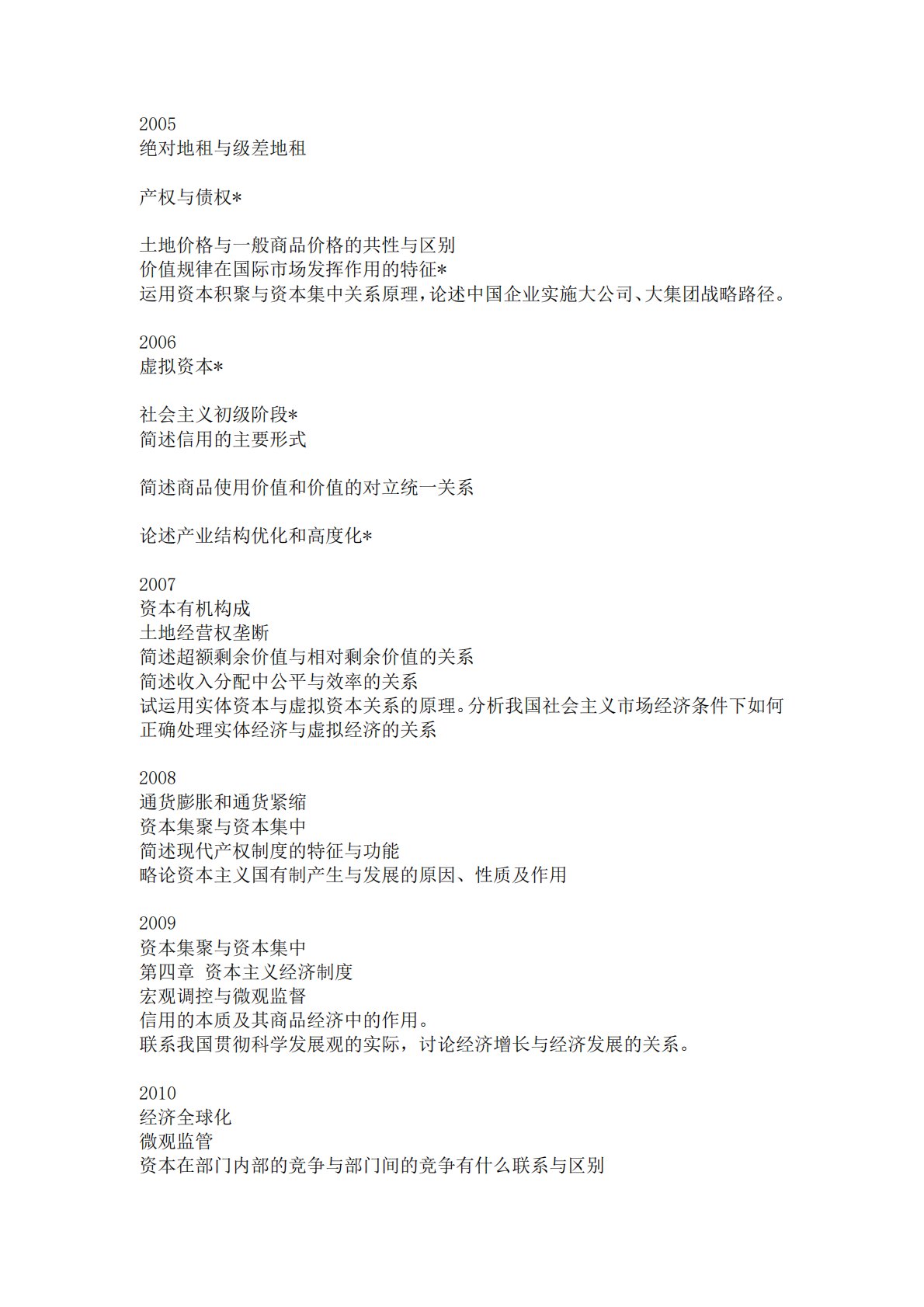 2005绝对地租与级差地租产权与债权*土地价格与一般商品价格的共性与区别价值规律在国际市场发挥作用的特征*运用资本积聚与资本集中关系原理,论述中国企业实施大公司、大集团战略路径。2006虚拟资本*社会主义初级阶段*简述信用的主要形式简述商品使用价值和价值的对立统一关系论述产业结构优化和高度化*2007资本有机构成土地经营权垄断简述超额剩余价值与相对剩余价值的关系简述收入分配中公平与效率的关系试运用实体资本与虚拟资本关系的原理。分析我国社会主义市场经济条件下如何正确处理实体经济与虚拟经济的关系2008通货膨胀和通货紧缩资本集聚与资本集中简述现代产权制度的特征与功能略论资本主义国有制产生与发展的原...