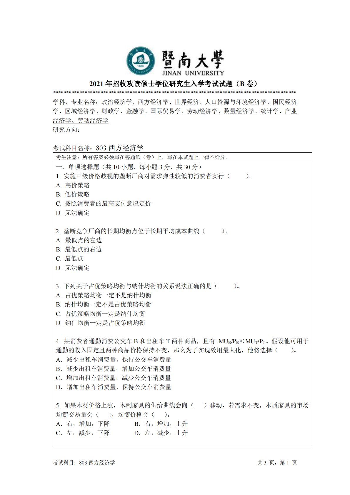 考试科目:803西方经济学共3页,第1页2021年招收攻读硕士学位研究生入学考试试题(B卷)********************************************************************************************学科、专业名称:政治经济学、西方经济学、世界经济、人口资源与环境经济学、国民经济学、区域经济学、财政学、金融学、国际贸易学、劳动经济学、数量经济学、统计学、产业经济学、劳动经济学研究方向:考试科目名称:803西方经济学考生注意:所有答案必须写在答题纸(卷)上,写在本试题上一律不给分。一、单项选择题(共10小题,每小题3分,...