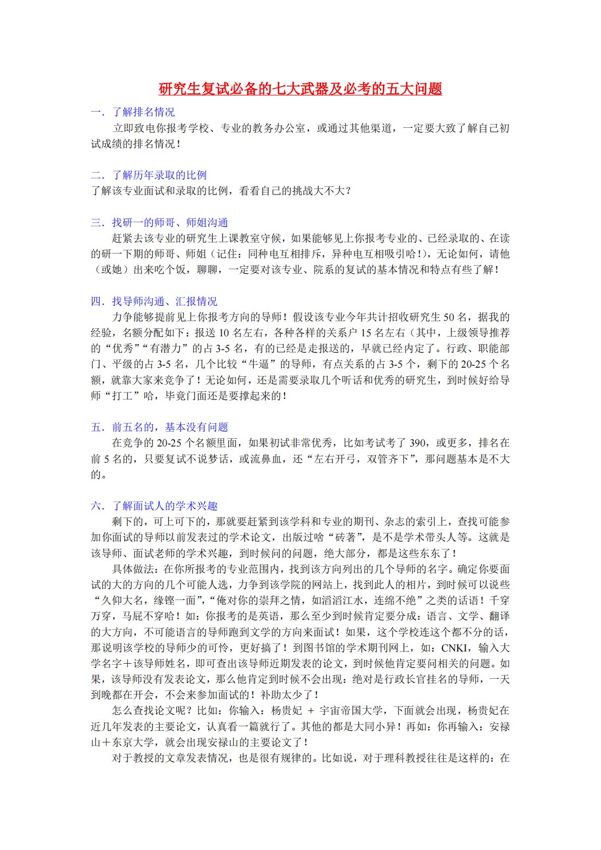 研究生复试必备的七大武器及必考的五大问题一.了解排名情况立即致电你报考学校、专业的教务办公室,或通过其他渠道,一定要大致了解自己初试成绩的排名情况!二.了解历年录取的比例了解该专业面试和录取的比例,看看自己的挑战大不大?三.找研一的师哥、师姐沟通赶紧去该专业的研究生上课教室守候,如果能够见上你报考专业的、已经录取的、在读的研一下期的师哥、师姐(记住:同种电互相排斥,异种电互相吸引哈!),无论如何,请他(或她)出来吃个饭,聊聊,一定要对该专业、院系的复试的基本情况和特点有些了解!四.找导师沟通、汇报情况力争能够提前见上你报考方向的导师!假设该专业今年共计招收研究生50名,据我的经验,名额分配如下...