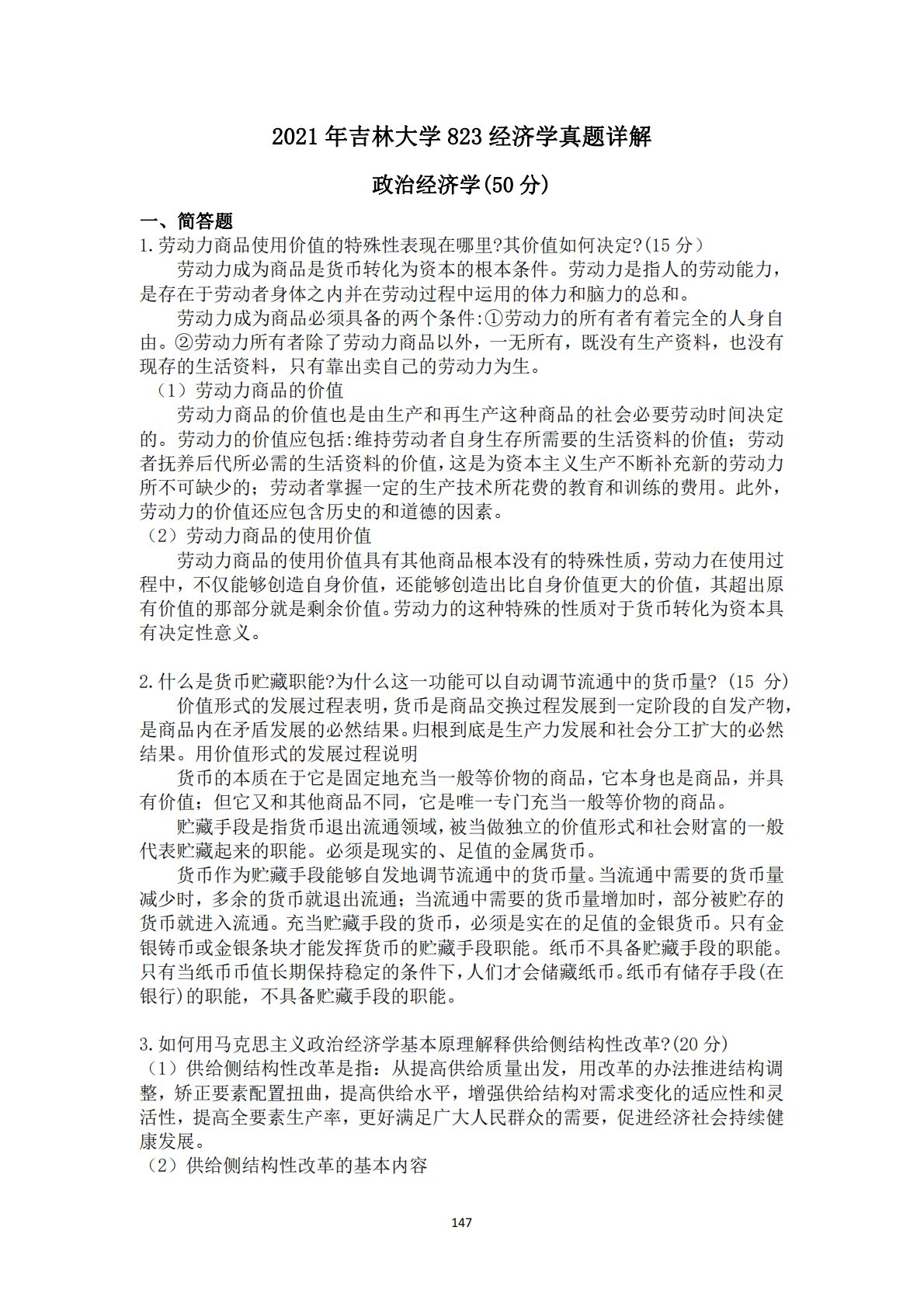 吉林大学823经济学(政治经济学、西方经济学)2021年真题答案