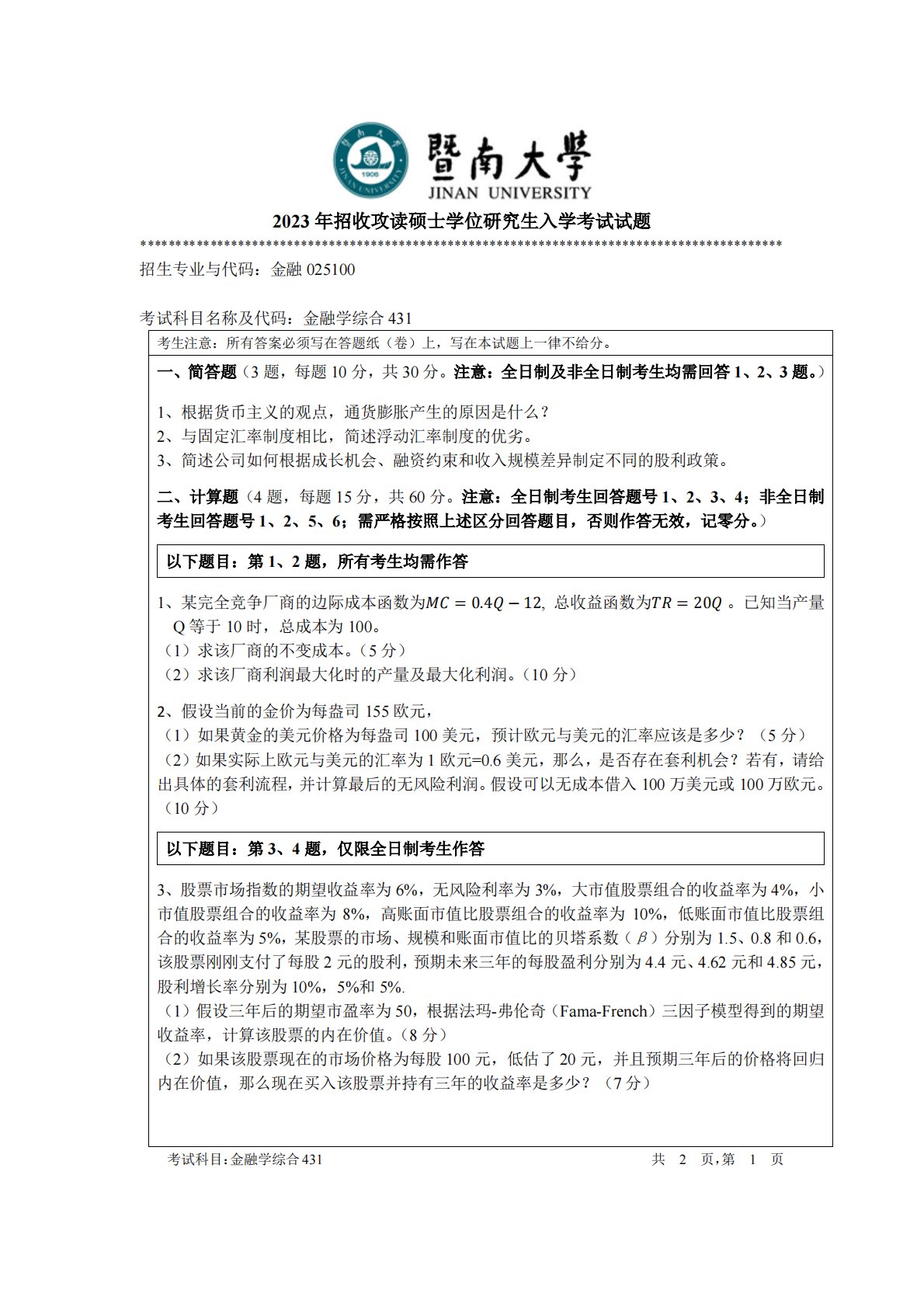 暨南大学431金融学综合2023年真题