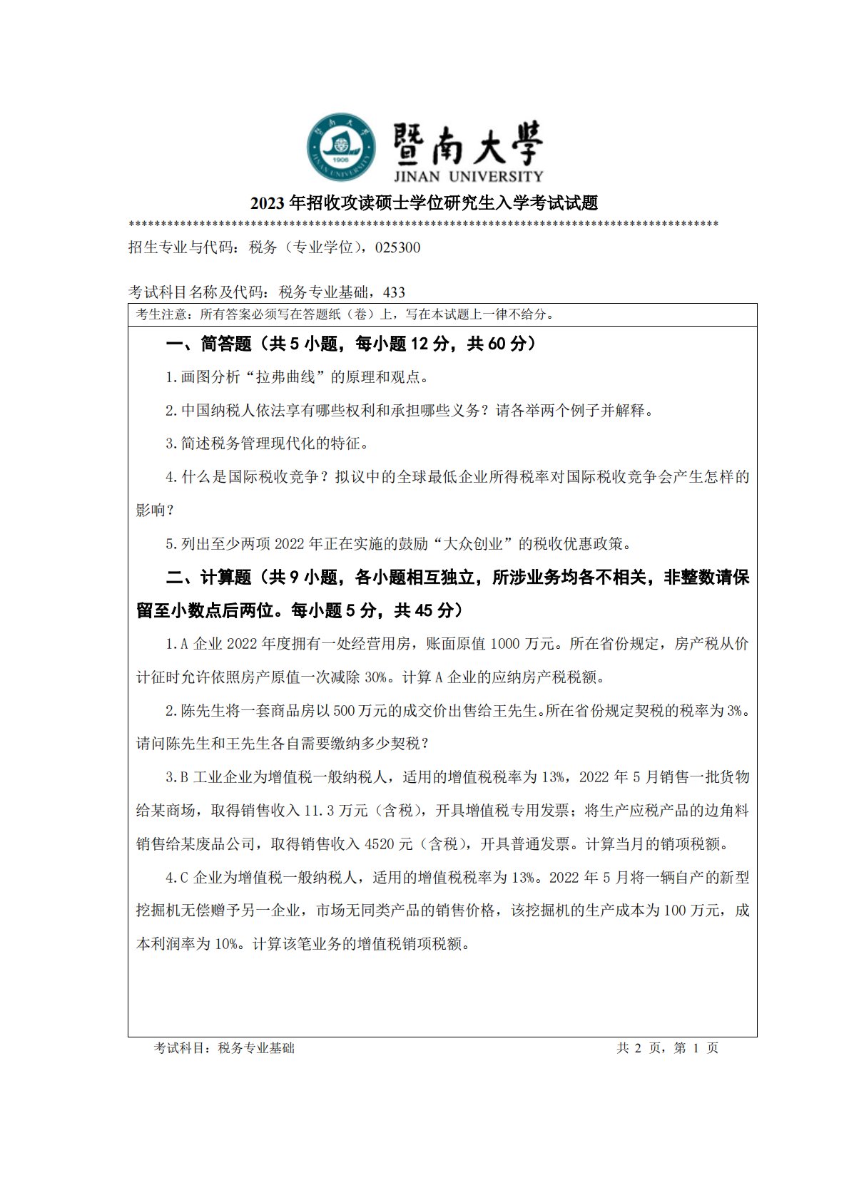 2023年招收攻读硕士学位研究生入学考试试题********************************************************************************************招生专业与代码:税务(专业学位),025300考试科目名称及代码:税务专业基础,433考生注意:所有答案必须写在答题纸(卷)上,写在本试题上一律不给分。一、简答题(共5小题,每小题12分,共60分)1.画图分析“拉弗曲线”的原理和观点。2.中国纳税人依法享有哪些权利和承担哪些义务?请各举两个例子并解释。3.简述税务管理现代化的特征。4.什么是国际税收竞争?拟议中的全球最...