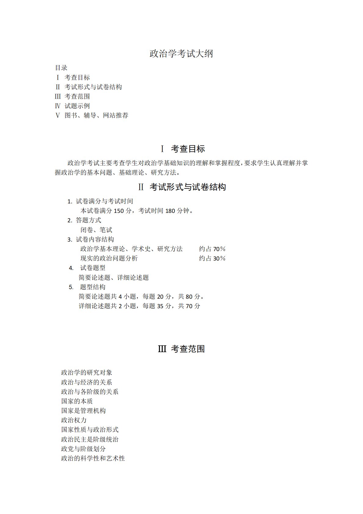 政治学考试大纲目录Ⅰ考查目标Ⅱ考试形式与试卷结构Ⅲ考查范围Ⅳ试题示例Ⅴ图书、辅导、网站推荐Ⅰ考查目标政治学考试主要考查学生对政治学基础知识的理解和掌握程度,要求学生认真理解并掌握政治学的基本问题、基础理论、研究方法。Ⅱ考试形式与试卷结构1.试卷满分与考试时间本试卷满分150分,考试时间180分钟。2.答题方式闭卷、笔试3.试卷内容结构政治学基本理论、学术史、研究方法约占70%现实的政治问题分析约占30%4.试卷题型简要论述题、详细论述题5.题型结构简要论述题共4小题,每题20分,共80分。详细论述题共2小题,每题35分,共70分Ⅲ考查范围政治学的研究对象政治与经济的关系政治与各阶级的关系国家的...