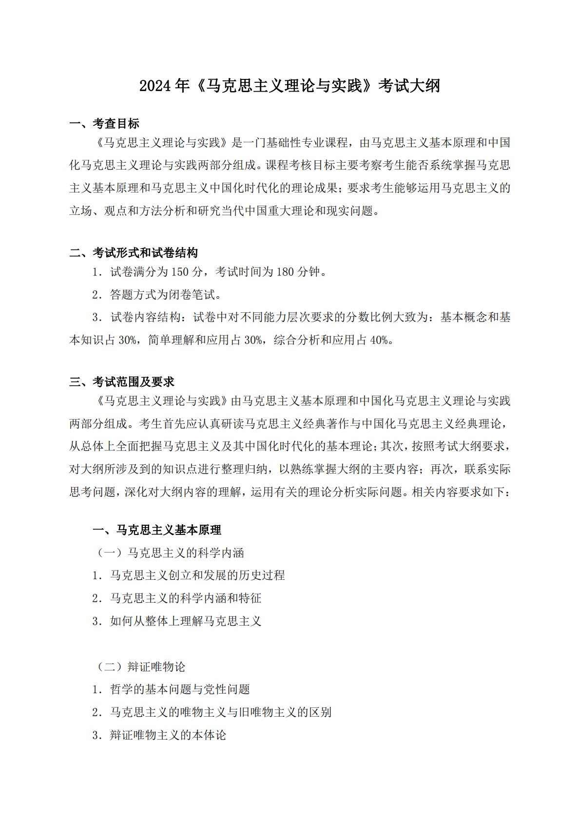 2024年《马克思主义理论与实践》考试大纲一、考查目标《马克思主义理论与实践》是一门基础性专业课程,由马克思主义基本原理和中国化马克思主义理论与实践两部分组成。课程考核目标主要考察考生能否系统掌握马克思主义基本原理和马克思主义中国化时代化的理论成果;要求考生能够运用马克思主义的立场、观点和方法分析和研究当代中国重大理论和现实问题。二、考试形式和试卷结构1.试卷满分为150分,考试时间为180分钟。2.答题方式为闭卷笔试。3.试卷内容结构:试卷中对不同能力层次要求的分数比例大致为:基本概念和基本知识占30%,简单理解和应用占30%,综合分析和应用占40%。三、考试范围及要求《马克思主义理论与实践...