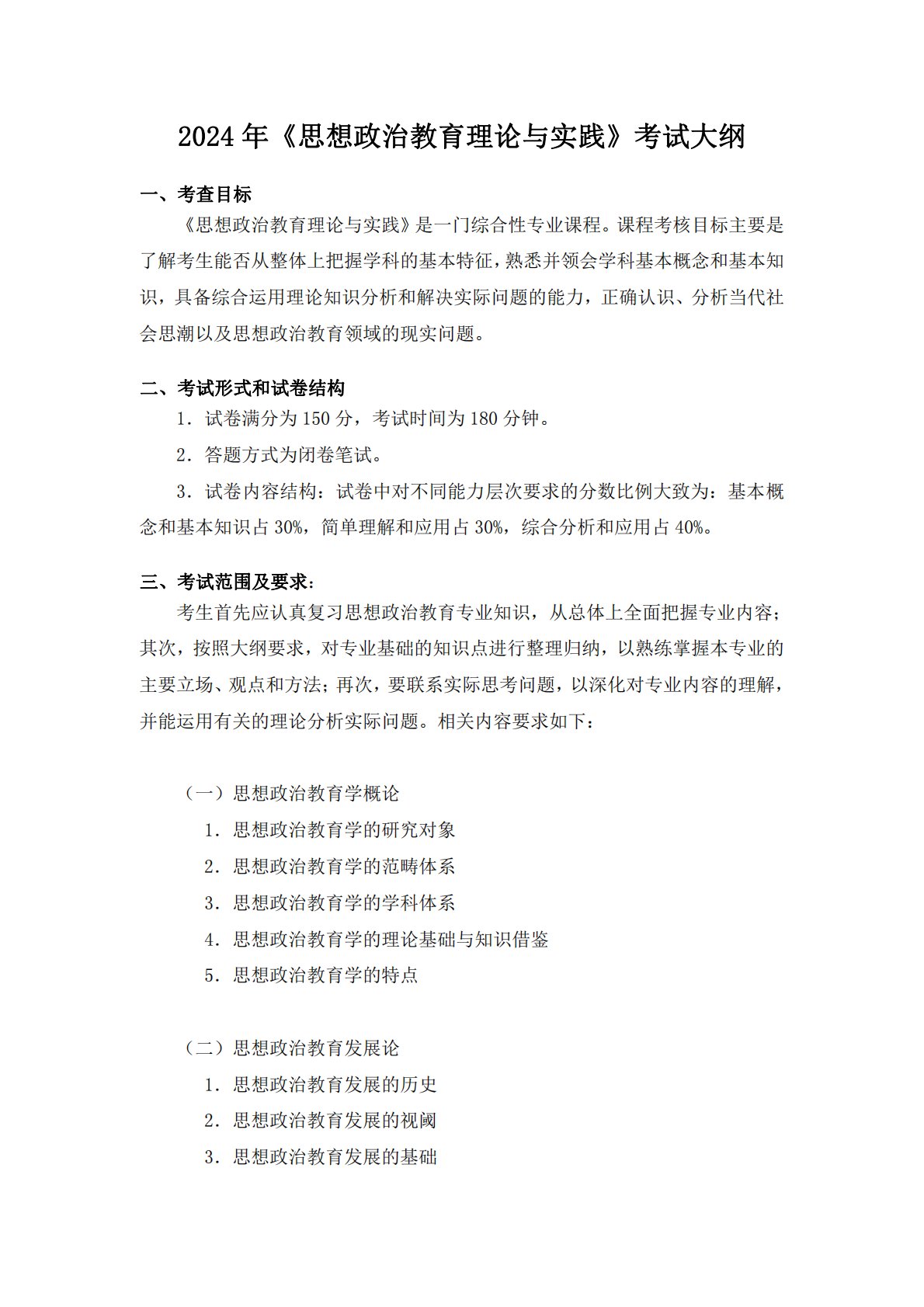 2024年《思想政治教育理论与实践》考试大纲一、考查目标《思想政治教育理论与实践》是一门综合性专业课程。课程考核目标主要是了解考生能否从整体上把握学科的基本特征,熟悉并领会学科基本概念和基本知识,具备综合运用理论知识分析和解决实际问题的能力,正确认识、分析当代社会思潮以及思想政治教育领域的现实问题。二、考试形式和试卷结构1.试卷满分为150分,考试时间为180分钟。2.答题方式为闭卷笔试。3.试卷内容结构:试卷中对不同能力层次要求的分数比例大致为:基本概念和基本知识占30%,简单理解和应用占30%,综合分析和应用占40%。三、考试范围及要求:考生首先应认真复习思想政治教育专业知识,从总体上全面...