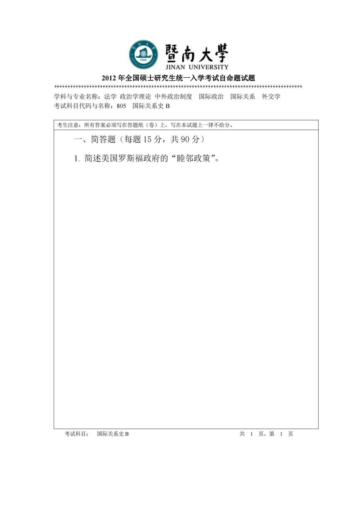 2012年全国硕士研究生统一入学考试自命题试题********************************************************************************************学科与专业名称:法学政治学理论中外政治制度国际政治国际关系外交学考试科目代码与名称:805国际关系史B考生注意:所有答案必须写在答题纸(卷)上,写在本试题上一律不给分。一、简答题(每题15分,共90分)1.简述美国罗斯福政府的“睦邻政策”。考试科目:国际关系史B共1页,第1页2012年全国硕士研究生统一入学考试自命题试题************************...