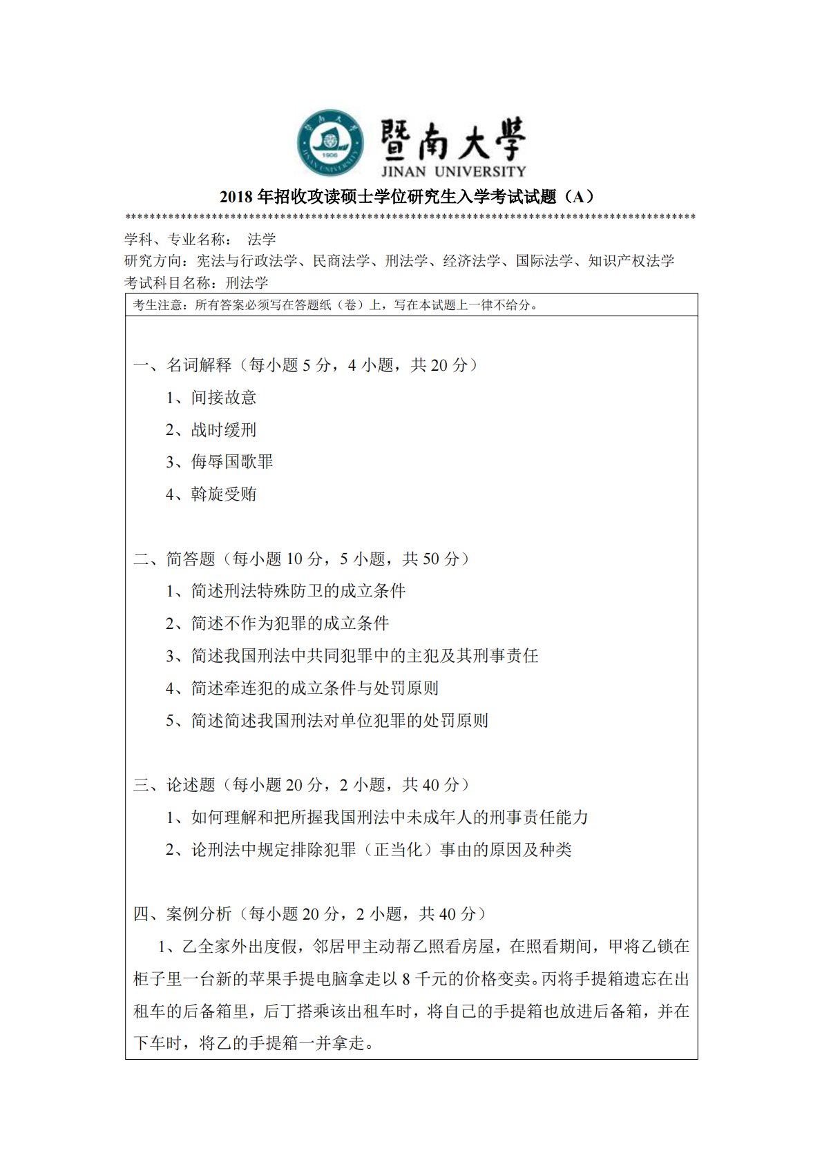 暨南大学804刑法学2018年真题