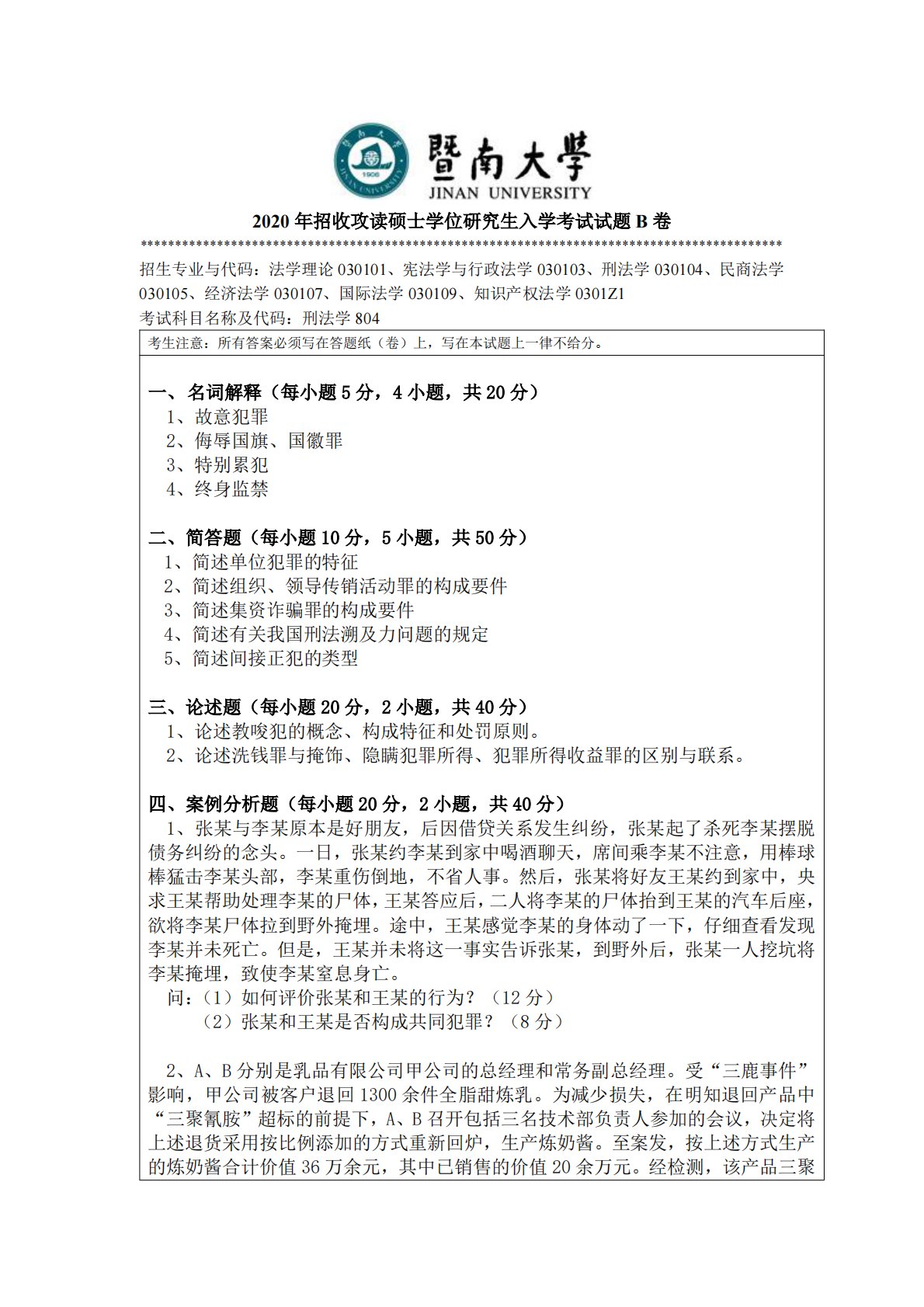 2020年招收攻读硕士学位研究生入学考试试题B卷********************************************************************************************招生专业与代码:法学理论030101、宪法学与行政法学030103、刑法学030104、民商法学030105、经济法学030107、国际法学030109、知识产权法学0301Z1考试科目名称及代码:刑法学804考生注意:所有答案必须写在答题纸(卷)上,写在本试题上一律不给分。一、名词解释(每小题5分,4小题,共20分)1、故意犯罪2、侮辱国旗、国徽罪3、特别累犯4、...