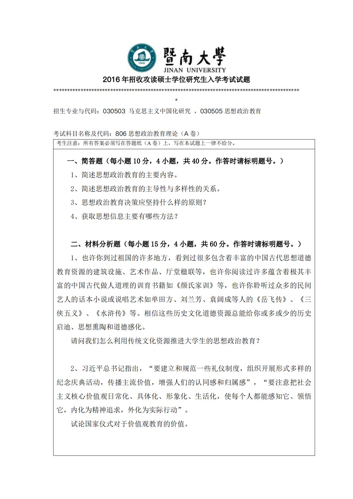 暨南大学806思想政治教育理论与实践2016年真题