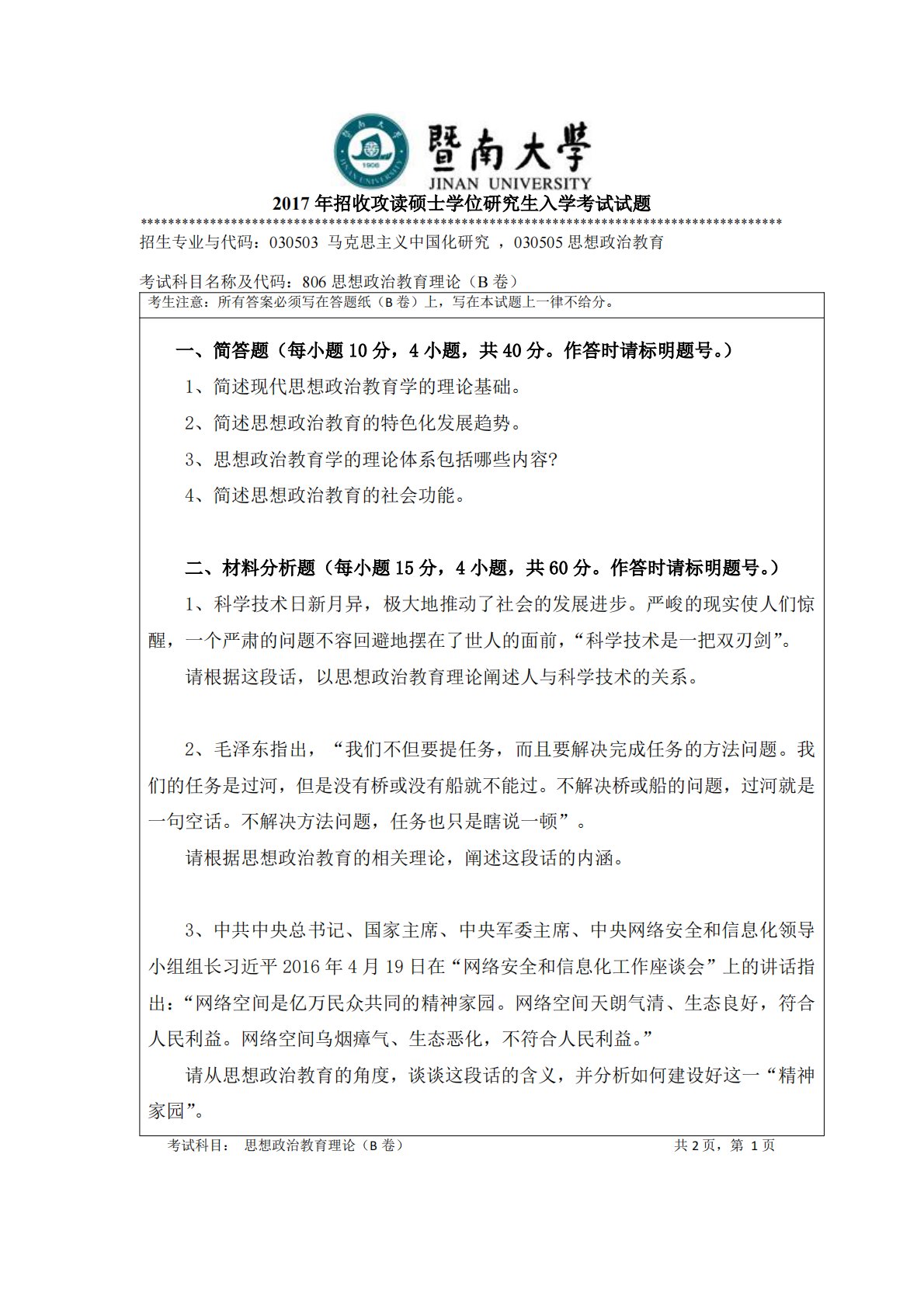 2017年招收攻读硕士学位研究生入学考试试题********************************************************************************************招生专业与代码:030503马克思主义中国化研究,030505思想政治教育考试科目名称及代码:806思想政治教育理论(B卷)考生注意:所有答案必须写在答题纸(B卷)上,写在本试题上一律不给分。一、简答题(每小题10分,4小题,共40分。作答时请标明题号。)1、简述现代思想政治教育学的理论基础。2、简述思想政治教育的特色化发展趋势。3、思想政治教育学的理论体系包括哪些内容...