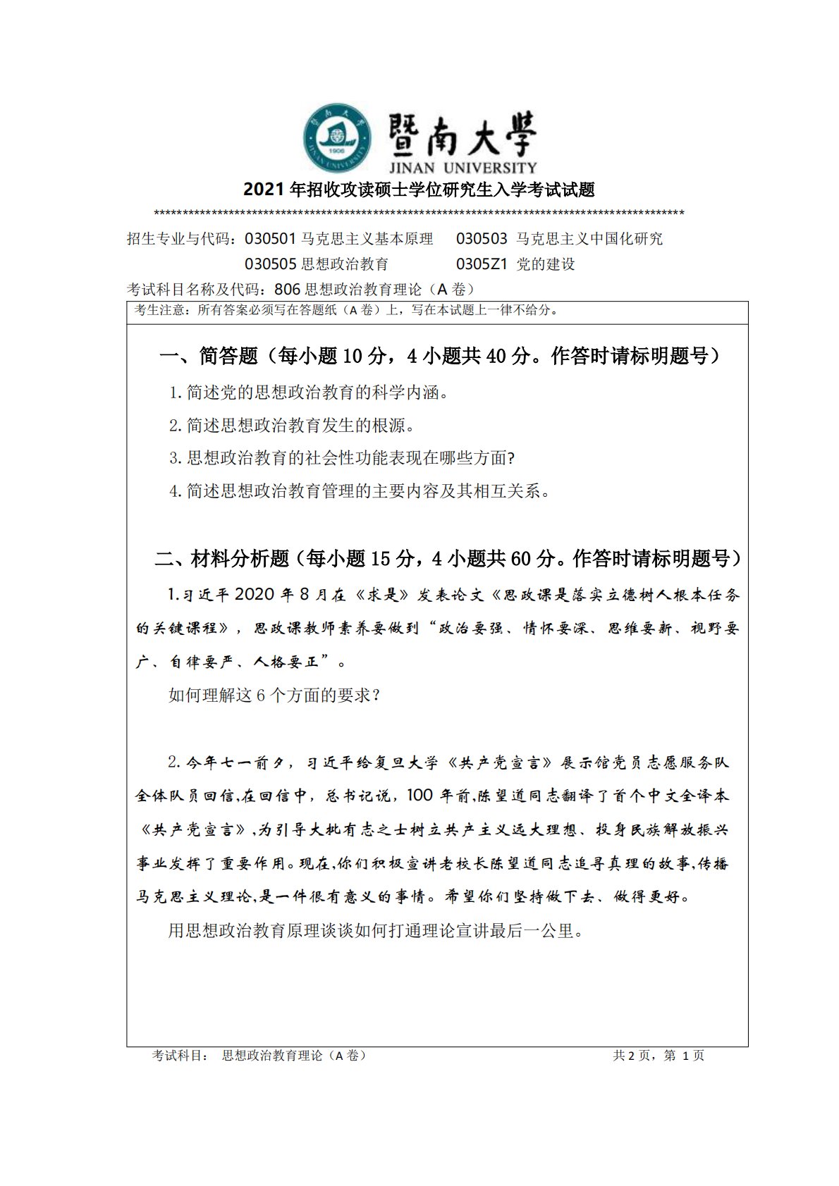 暨南大学806思想政治教育理论与实践2021年真题