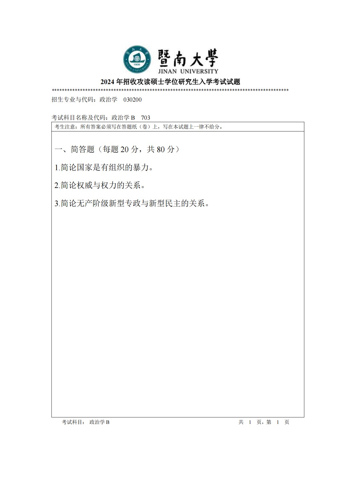 2024年招收攻读硕士学位研究生入学考试试题********************************************************************************************招生专业与代码:政治学030200考试科目名称及代码:政治学B703考生注意:所有答案必须写在答题纸(卷)上,写在本试题上一律不给分。一、简答题(每题20分,共80分)1.简论国家是有组织的暴力。2.简论权威与权力的关系。3.简论无产阶级新型专政与新型民主的关系。考试科目:政治学B共1页,第1页2024年招收攻读硕士学位研究生入学考试试题****************...