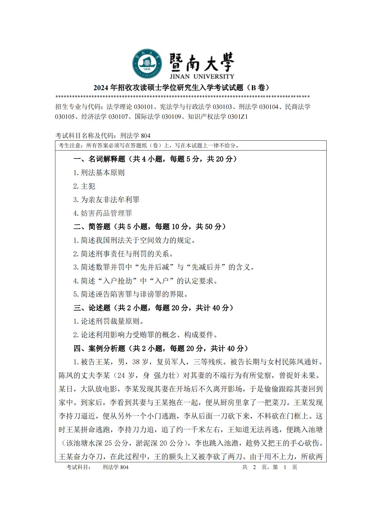 2024年招收攻读硕士学位研究生入学考试试题(B卷)********************************************************************************************招生专业与代码:法学理论030101、宪法学与行政法学030103、刑法学030104、民商法学030105、经济法学030107、国际法学030109、知识产权法学0301Z1考试科目名称及代码:刑法学804考生注意:所有答案必须写在答题纸(卷)上,写在本试题上一律不给分。一、名词解释题(共4小题,每题5分,共20分)1.刑法基本原则2.主犯3.为亲友非法牟利...