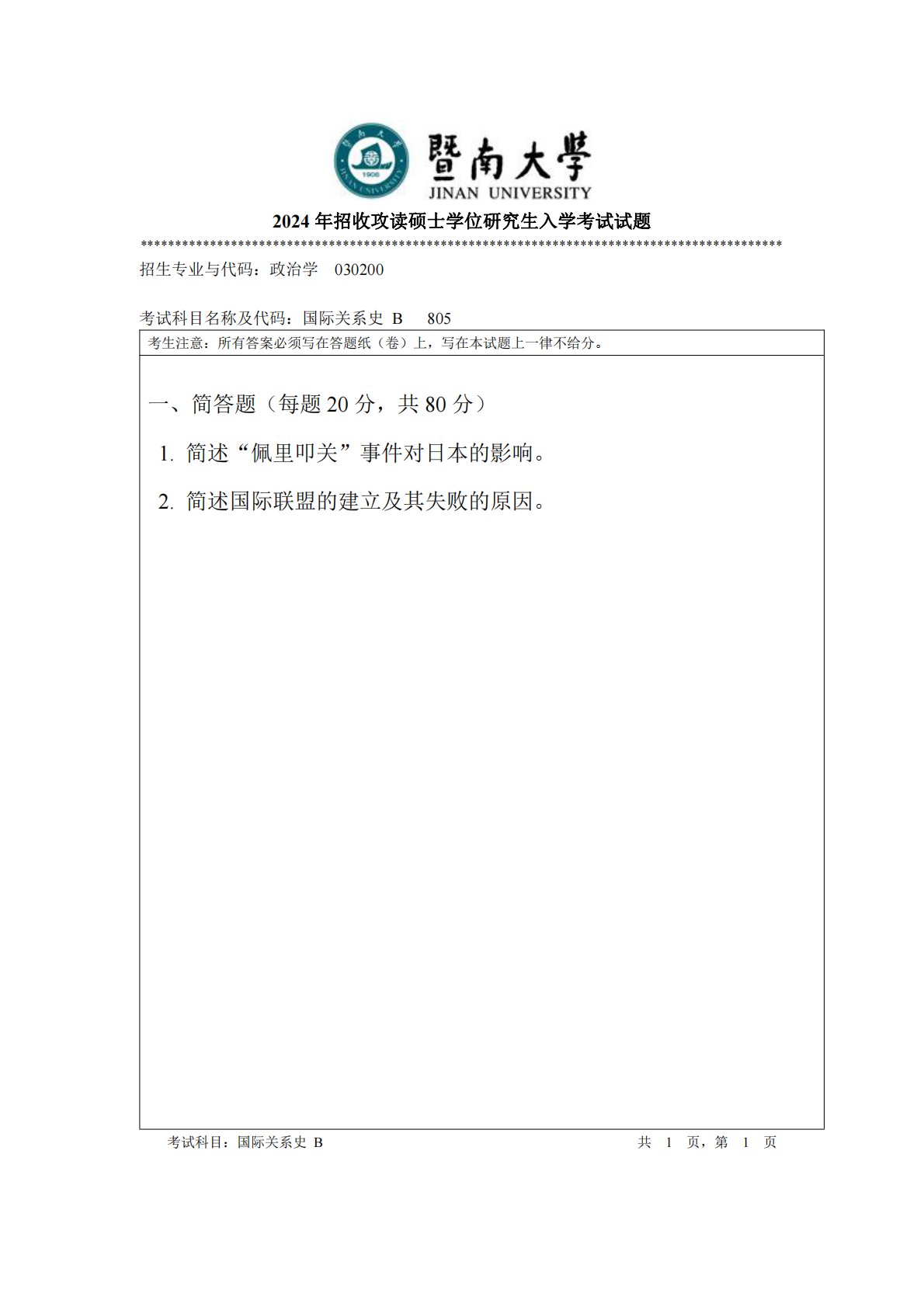 暨南大学805国际关系史2024年真题