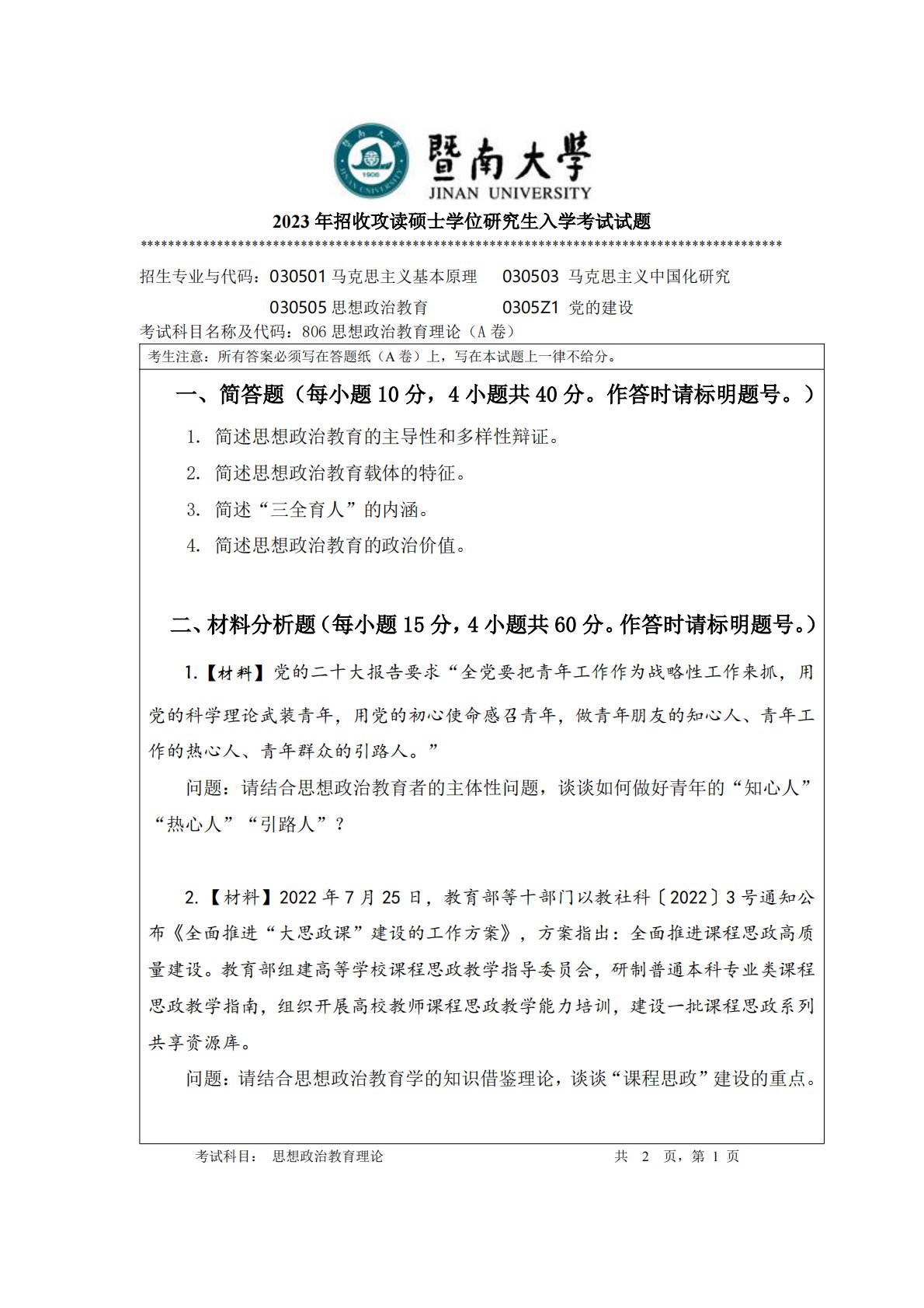 暨南大学806思想政治教育理论与实践2023年真题