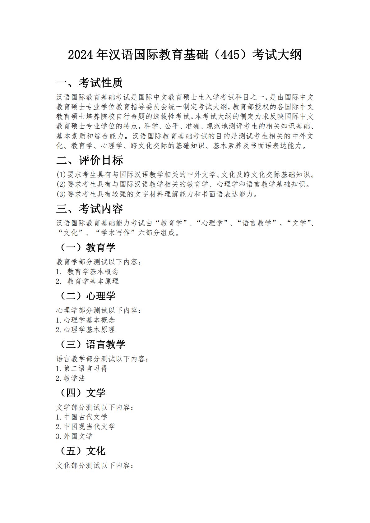 2024年汉语国际教育基础(445)考试大纲一、考试性质汉语国际教育基础考试是国际中文教育硕士生入学考试科目之一,是由国际中文教育硕士专业学位教育指导委员会统一制定考试大纲,教育部授权的各国际中文教育硕士培养院校自行命题的选拔性考试。本考试大纲的制定力求反映国际中文教育硕士专业学位的特点,科学、公平、准确、规范地测评考生的相关知识基础、基本素质和综合能力。汉语国际教育基础考试的目的是测试考生相关的中外文化、教育学、心理学、跨文化交际的基础知识、基本素养及书面语表达能力。二、评价目标(1)要求考生具有与国际汉语教学相关的中外文学、文化及跨文化交际基础知识。(2)要求考生具有与国际汉语教学相关的教...