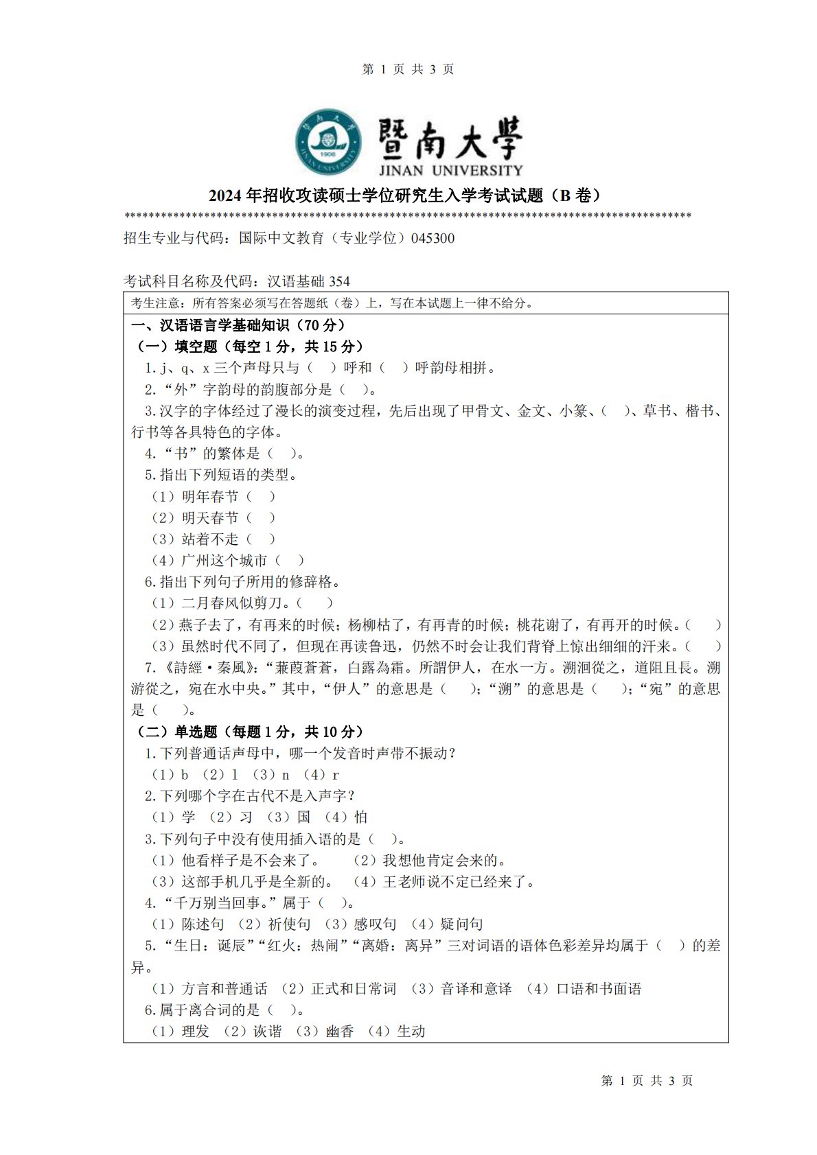 第1页共3页第1页共3页2024年招收攻读硕士学位研究生入学考试试题(B卷)********************************************************************************************招生专业与代码:国际中文教育(专业学位)045300考试科目名称及代码:汉语基础354考生注意:所有答案必须写在答题纸(卷)上,写在本试题上一律不给分。一、汉语语言学基础知识(70分)(一)填空题(每空1分,共15分)1.j、q、x三个声母只与()呼和()呼韵母相拼。2.“外”字韵母的韵腹部分是()。3.汉字的字体经过了漫长的演变过程,先...