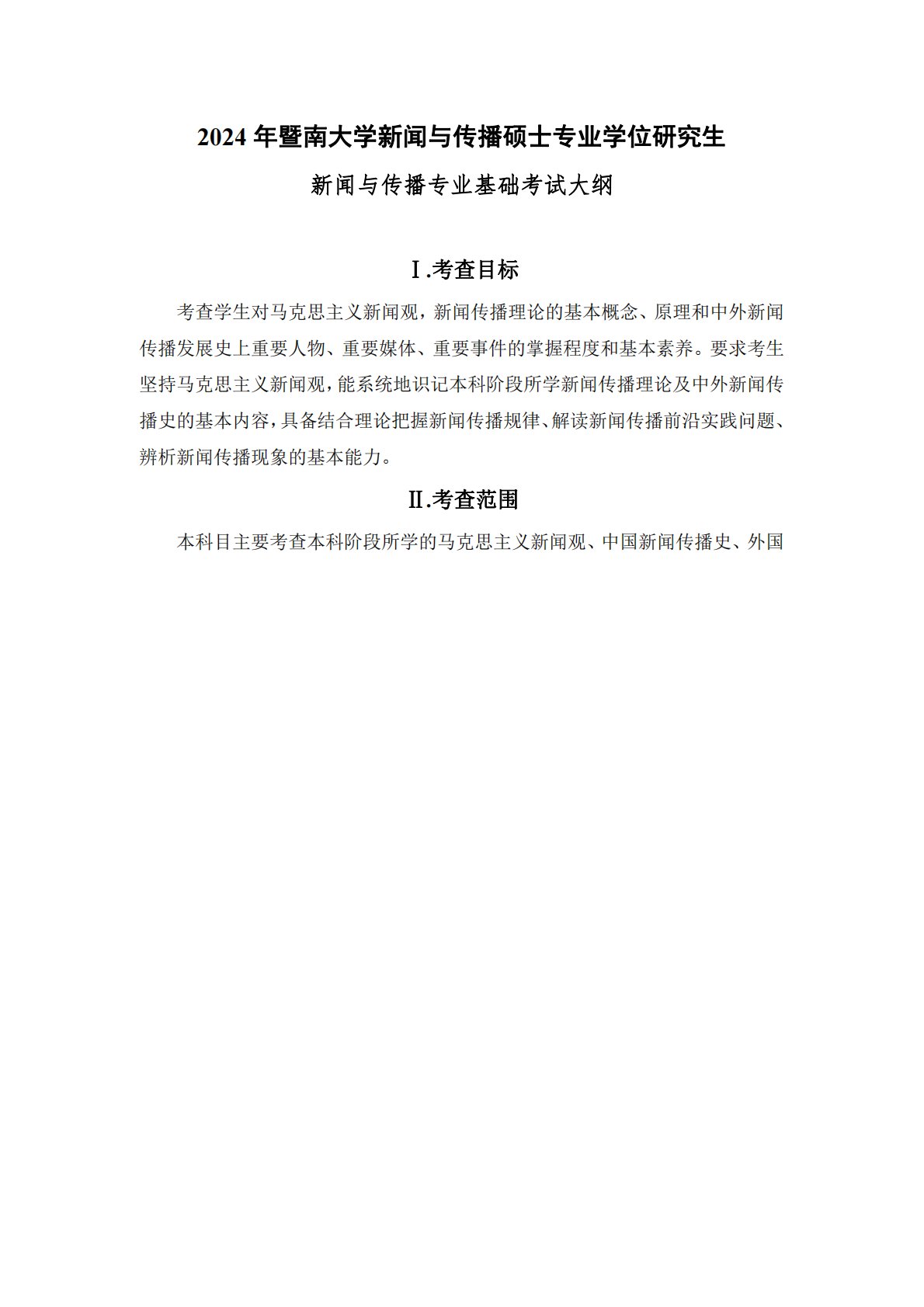 2024年暨南大学新闻与传播硕士专业学位研究生新闻与传播专业基础考试大纲Ⅰ.考查目标考查学生对马克思主义新闻观,新闻传播理论的基本概念、原理和中外新闻传播发展史上重要人物、重要媒体、重要事件的掌握程度和基本素养。要求考生坚持马克思主义新闻观,能系统地识记本科阶段所学新闻传播理论及中外新闻传播史的基本内容,具备结合理论把握新闻传播规律、解读新闻传播前沿实践问题、辨析新闻传播现象的基本能力。Ⅱ.考查范围本科目主要考查本科阶段所学的马克思主义新闻观、中国新闻传播史、外国2024年暨南大学新闻与传播硕士专业学位研究生新闻与传播专业基础考试大纲Ⅰ.考查目标考查学生对马克思主义新闻观,新闻传播理论的基本概...