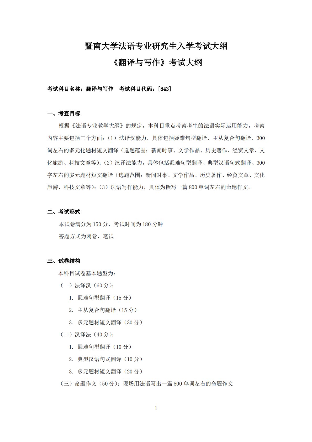 1暨南大学法语专业研究生入学考试大纲《翻译与写作》考试大纲考试科目名称:翻译与写作考试科目代码:[843]一、考查目标根据《法语专业教学大纲》的规定,本科目重点考察考生的法语实际运用能力,考察内容主要包括三个方面:(1)法译汉能力,具体包括疑难句型翻译、主从复合句翻译、300词左右的多元化题材短文翻译(选题范围:新闻时事、文学作品、历史著作、经贸文章、文化旅游、科技文章等);(2)汉译法能力,具体包括疑难句型翻译、典型汉语句式翻译、300字左右的多元题材短文翻译(选题范围:新闻时事、文学作品、历史著作、经贸文章、文化旅游、科技文章等);(3)法语写作能力,具体为撰写一篇800单词左右的命题作文...