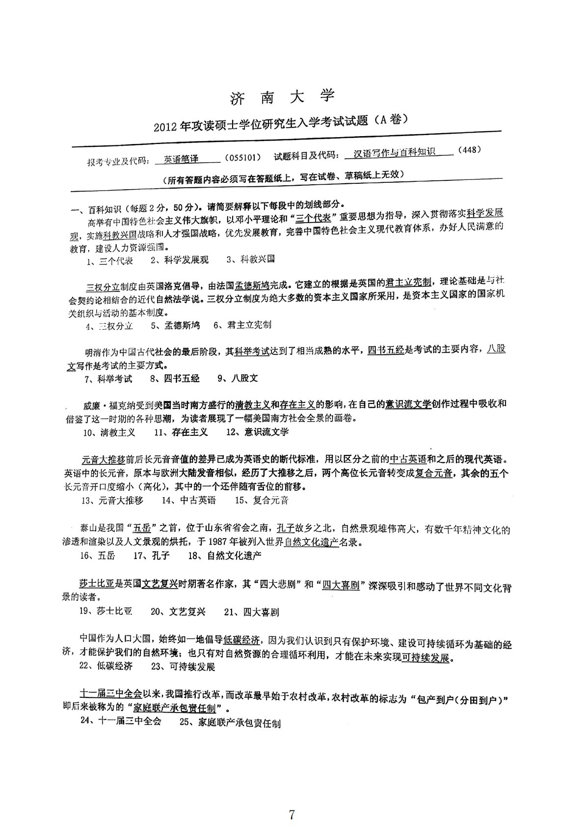 济南大学448汉语写作与百科知识2012年真题