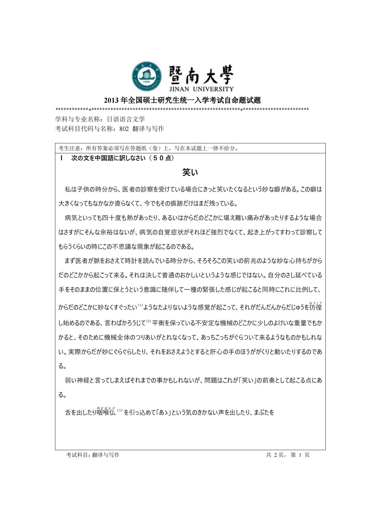 2013年全国硕士研究生统一入学考试自命题试题********************************************************************************************学科与专业名称:日语语言文学考试科目代码与名称:802翻译与写作考生注意:所有答案必须写在答题纸(卷)上,写在本试题上一律不给分。Ⅰ次の文を中国語に訳しなさい(50点)笑い私は子供の時分から、医者の診察を受けている場合にきっと笑いたくなるという妙な癖\る。この癖は大きくなってもなかなか直らなくて、今でもその痕跡だけはまだ残っている。病気といっても四十度も熱\ったり...