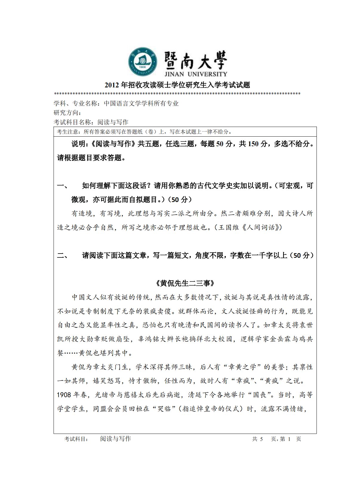 暨南大学807阅读与写作2012年真题