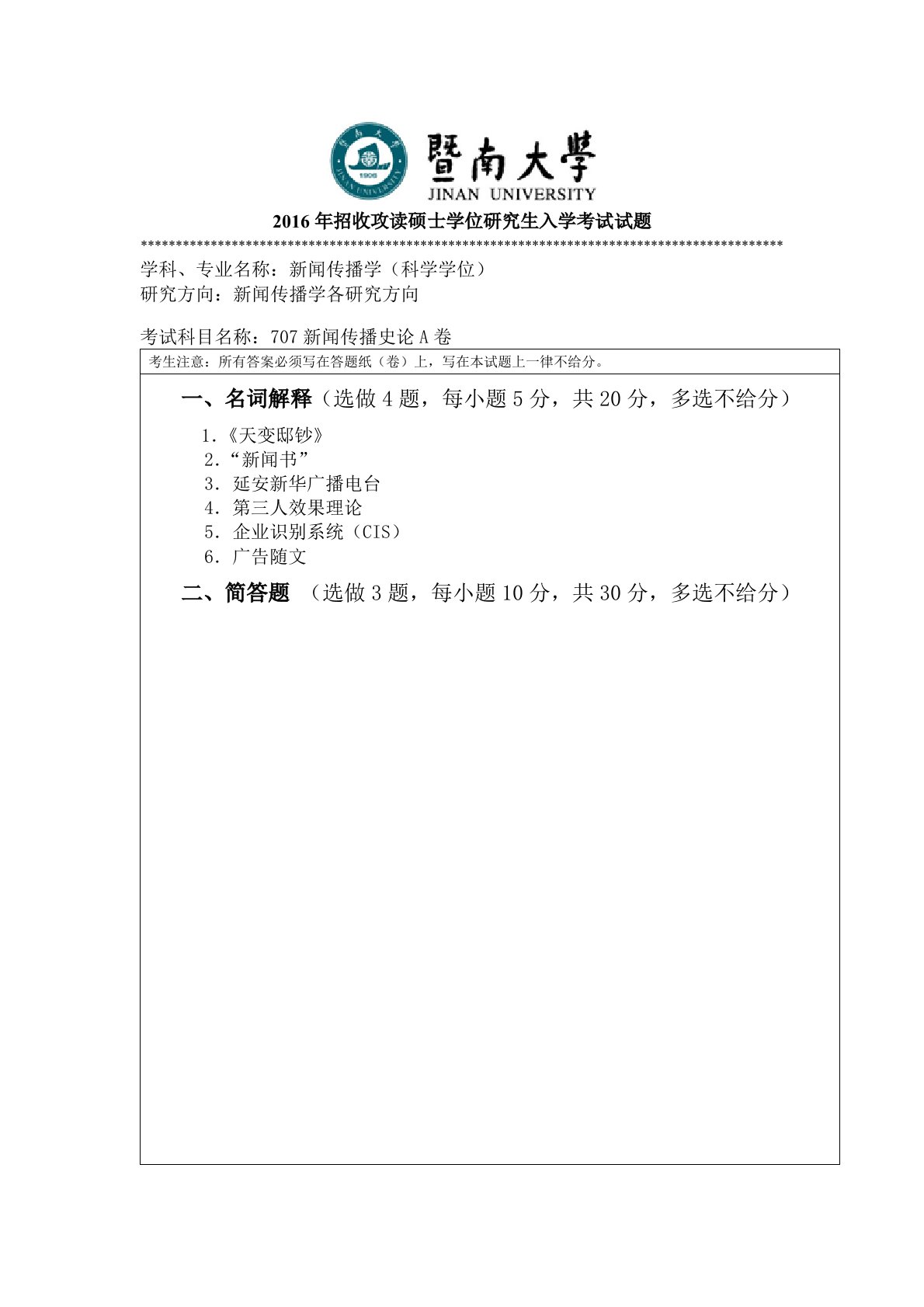 暨南大学707 新闻传播史论2016年真题.doc