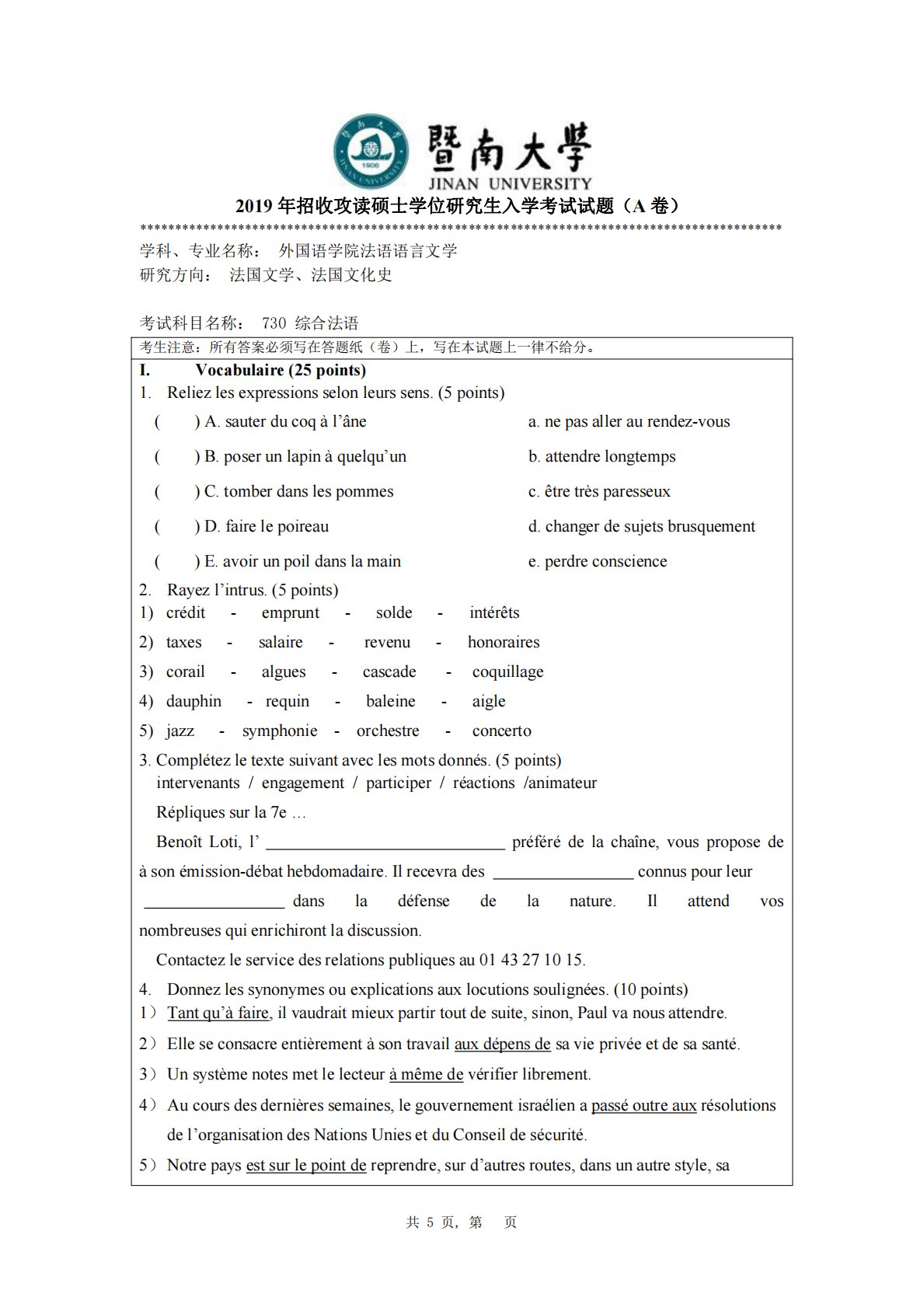 暨南大学730综合法语2019年真题
